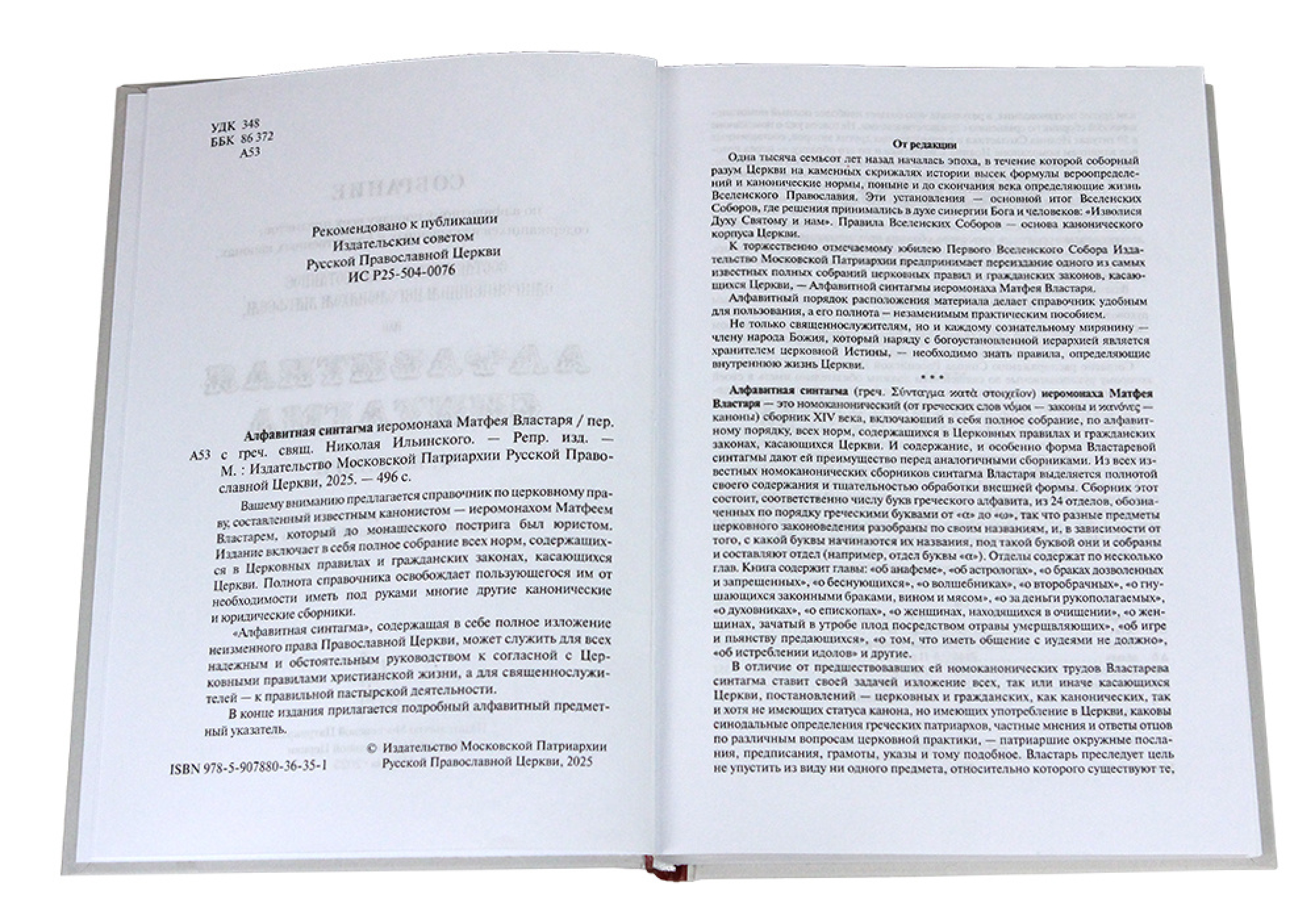 Вашему вниманию предлагается справочник по церковному праву, составленный известным канонистом — иеромонахом Матфеем Властарем, который до монашеского пострига был юристом. Издание включает в себя полное собрание всех норм, содержащихся в Церковных правилах и гражданских законах, касающихся Церкви. Полнота справочника освобождает пользующегося им от необходимости иметь под руками многие другие канонические и юридические сборники.