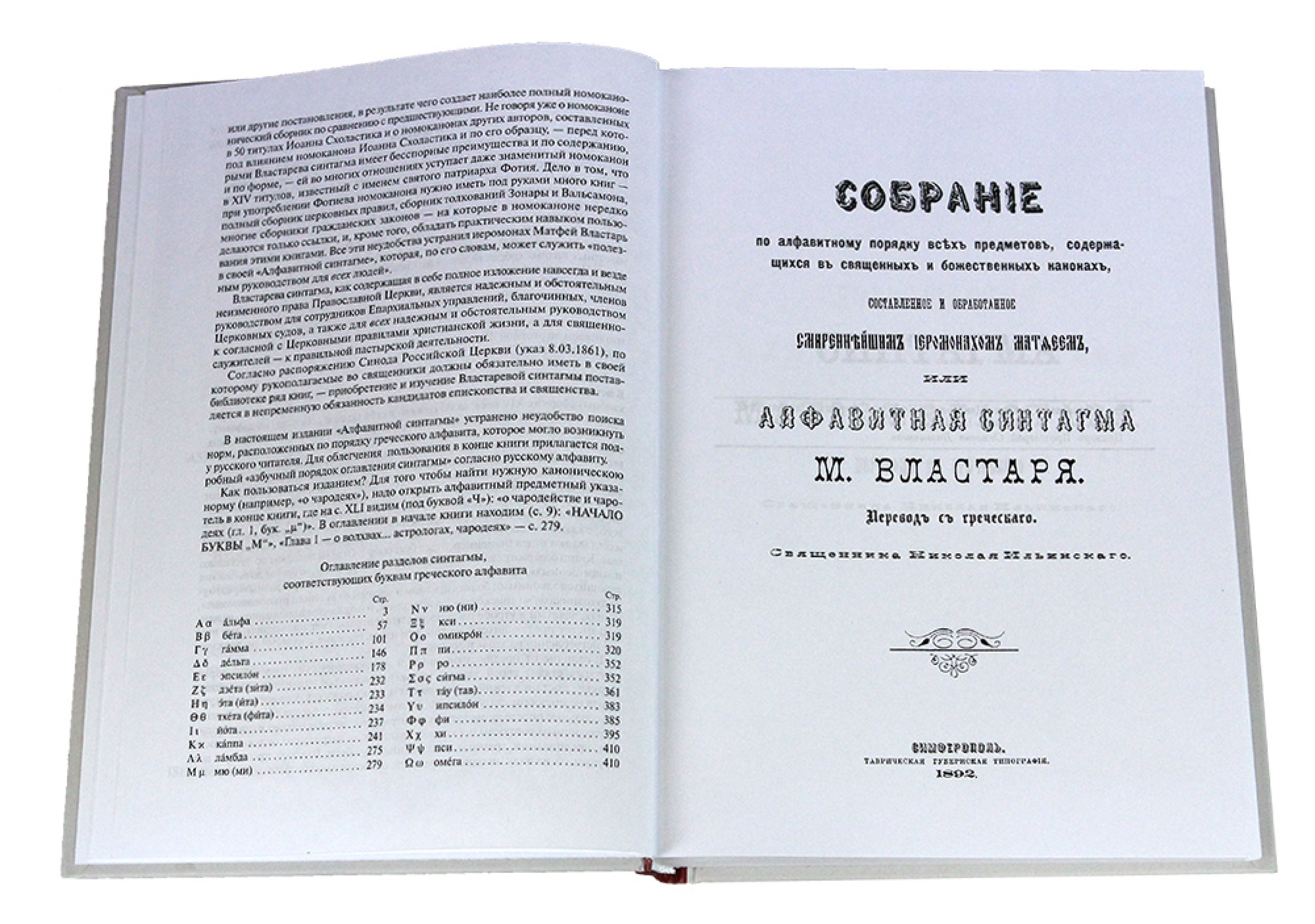 «Алфавитная синтагма», содержащая в себе полное изложение неизменного права Православной Церкви, может служить для всех надежным и обстоятельным руководством к согласной с Церковными правилами христианской жизни, а для священнослужителей — к правильной пастырской деятельности. В конце издания прилагается подробный алфавитный предметный указатель.