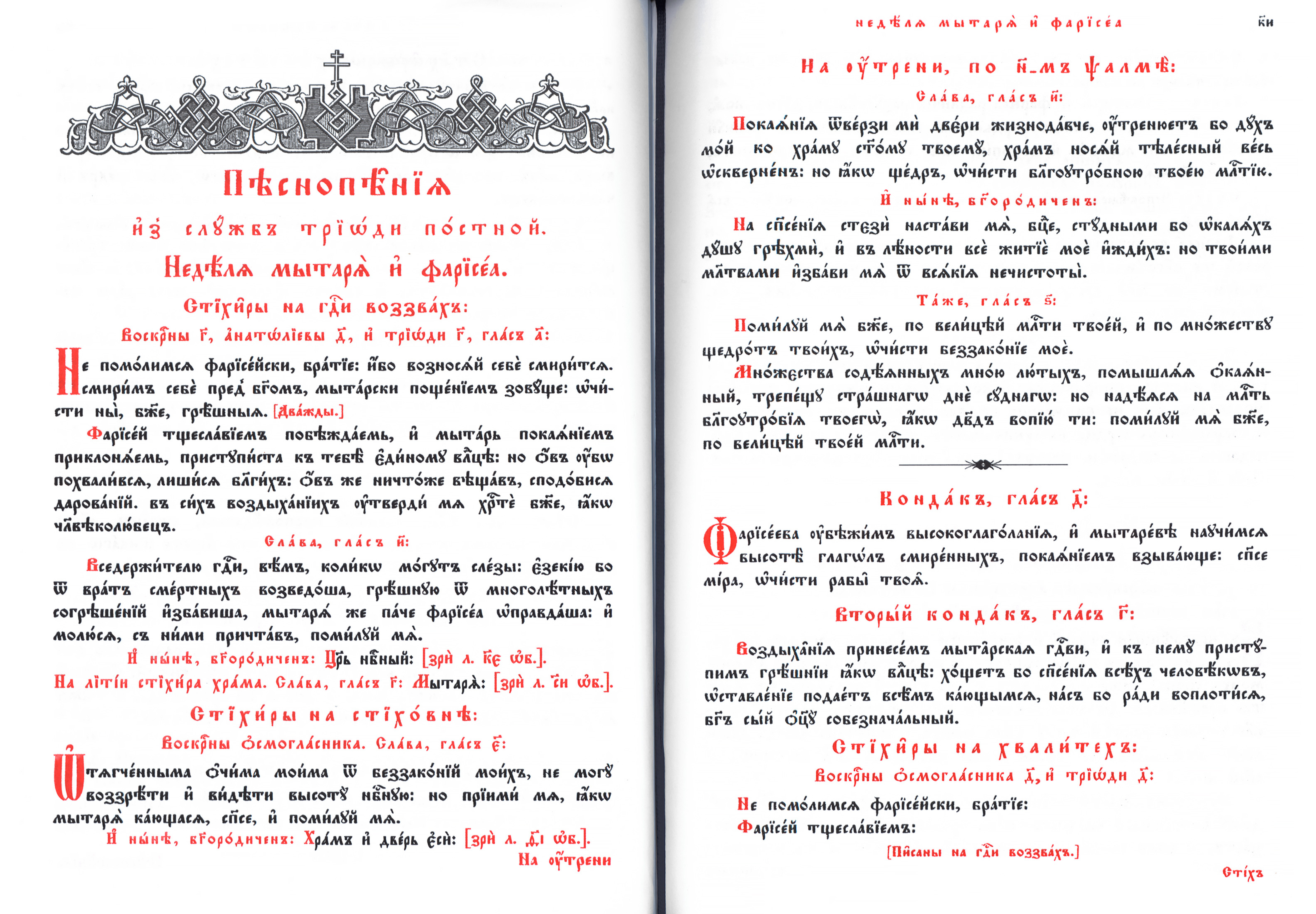 Книга включает указания Типикона о сочетании служб воскресных дней Триодей и молитвословий соответствующего гласа из главы «Песнопения службы воскресной» со ссылками на те листы, где напечатан полный текст этих молитвословий, указания о количестве поемых стихир, о катавасиях, о богородичных, — также со ссылками на надлежащие листы.