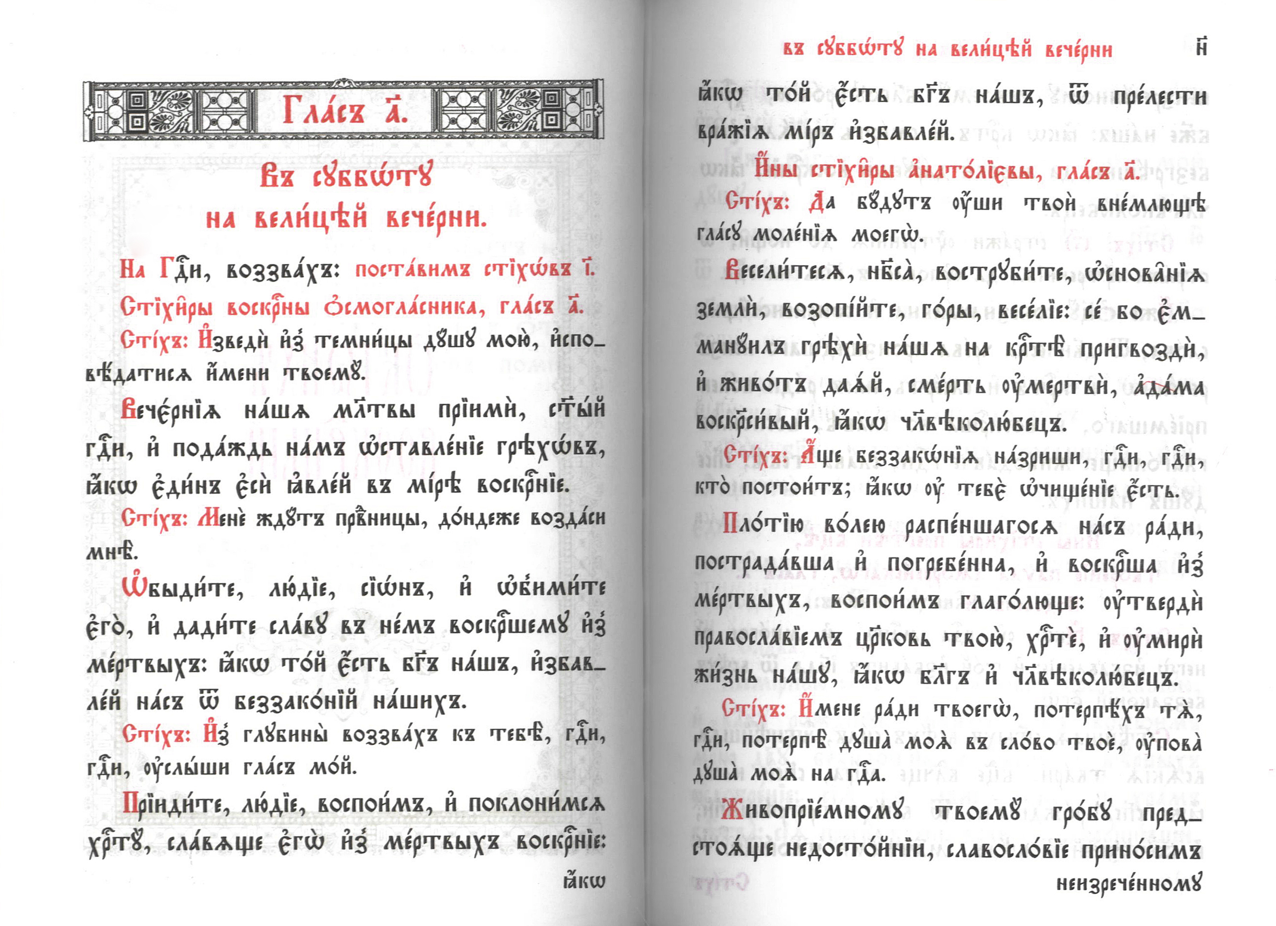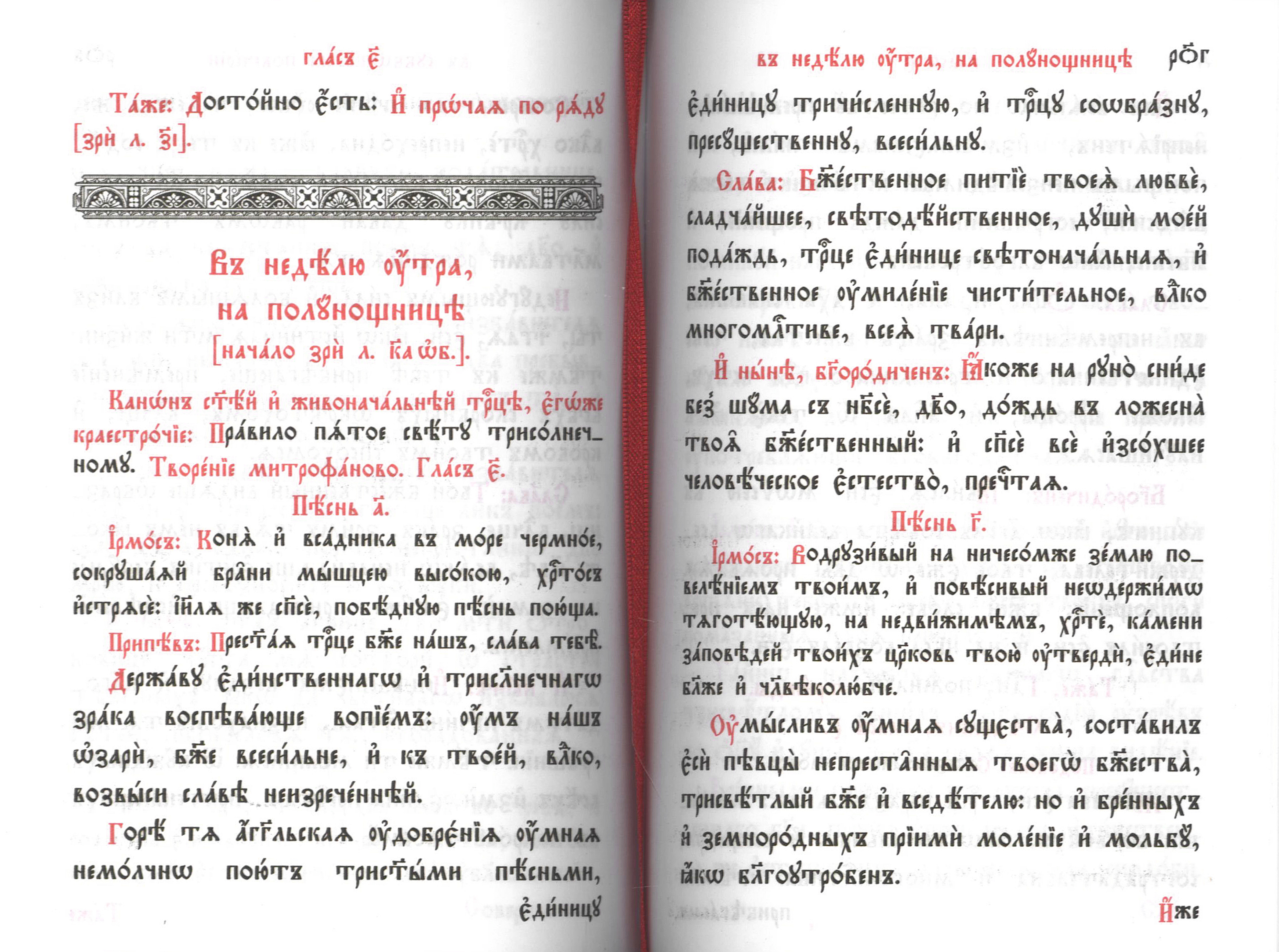 Сборник малого формата, напечатанный церковно-славянским шрифтом, предназначен для молитвенного прочтения воскресных богослужебных последований в тишине келейного уединения.