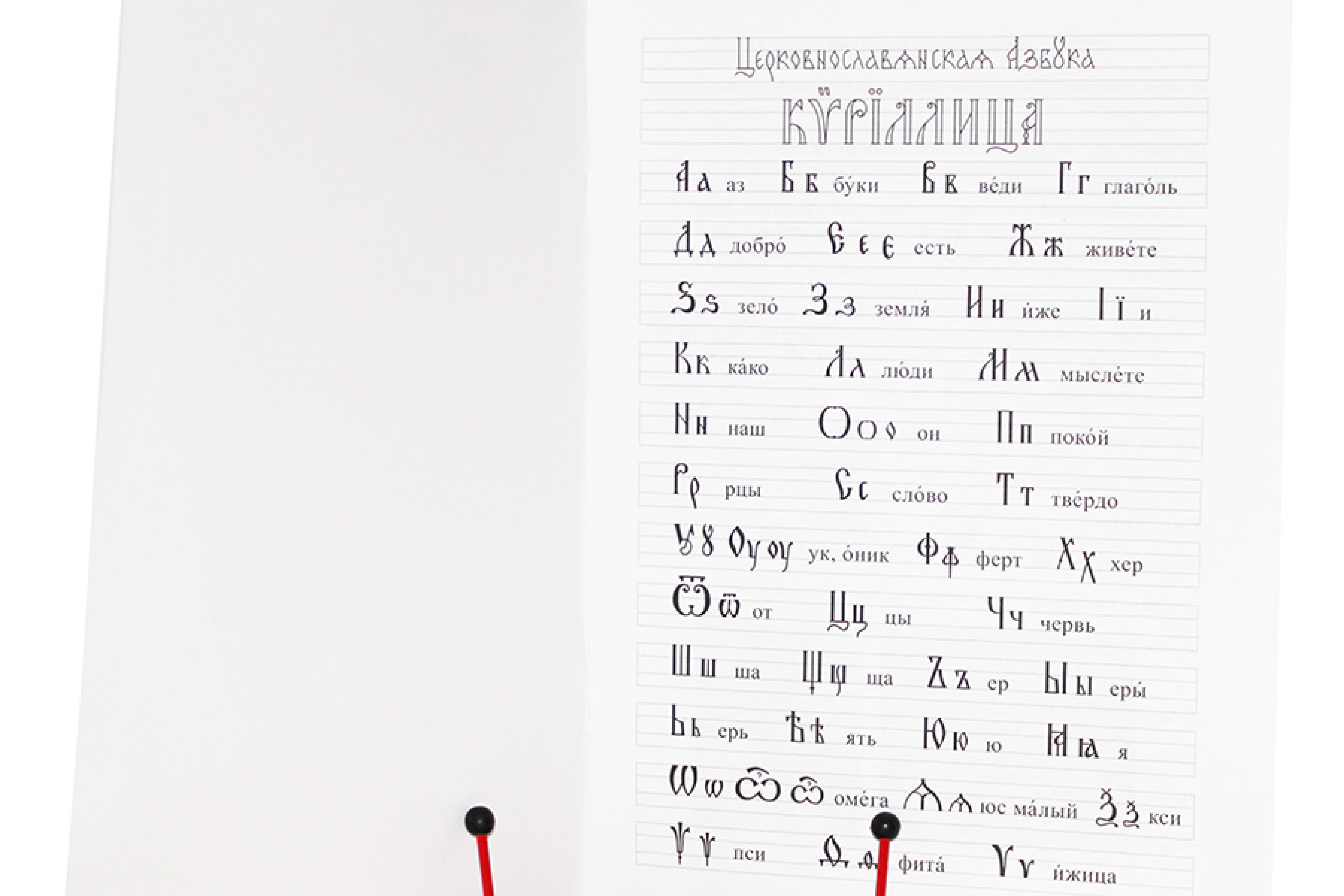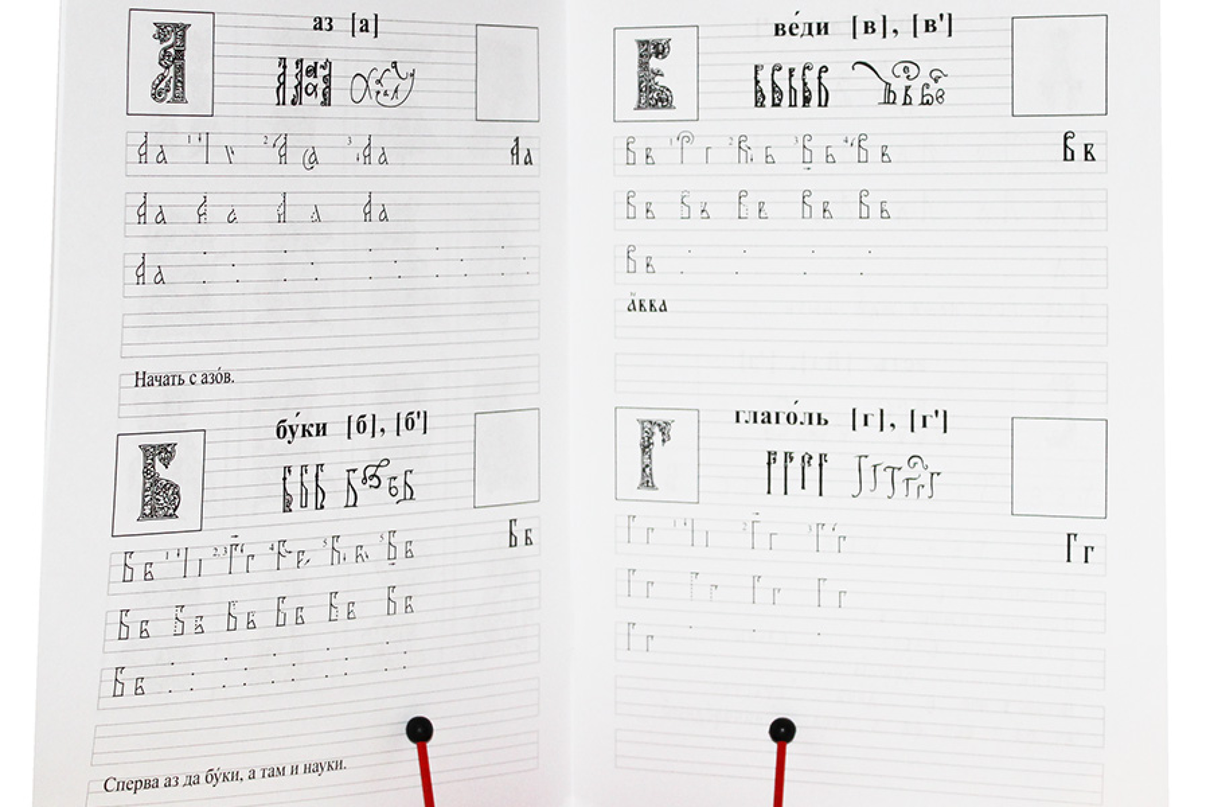 Прописи входят в состав учебно-методического комплекта по церковнославянскому языку для начинающих «Сперва Аз да Буки». Предназначены для овладения навыками кириллического письма и простейшими правилами церковнославянской орфографии. Представленные образцы заглавных буквиц выполнены по мотивам рукописных книг. В прописи включён перечень имён в соответствии с церковнославянской орфографией.