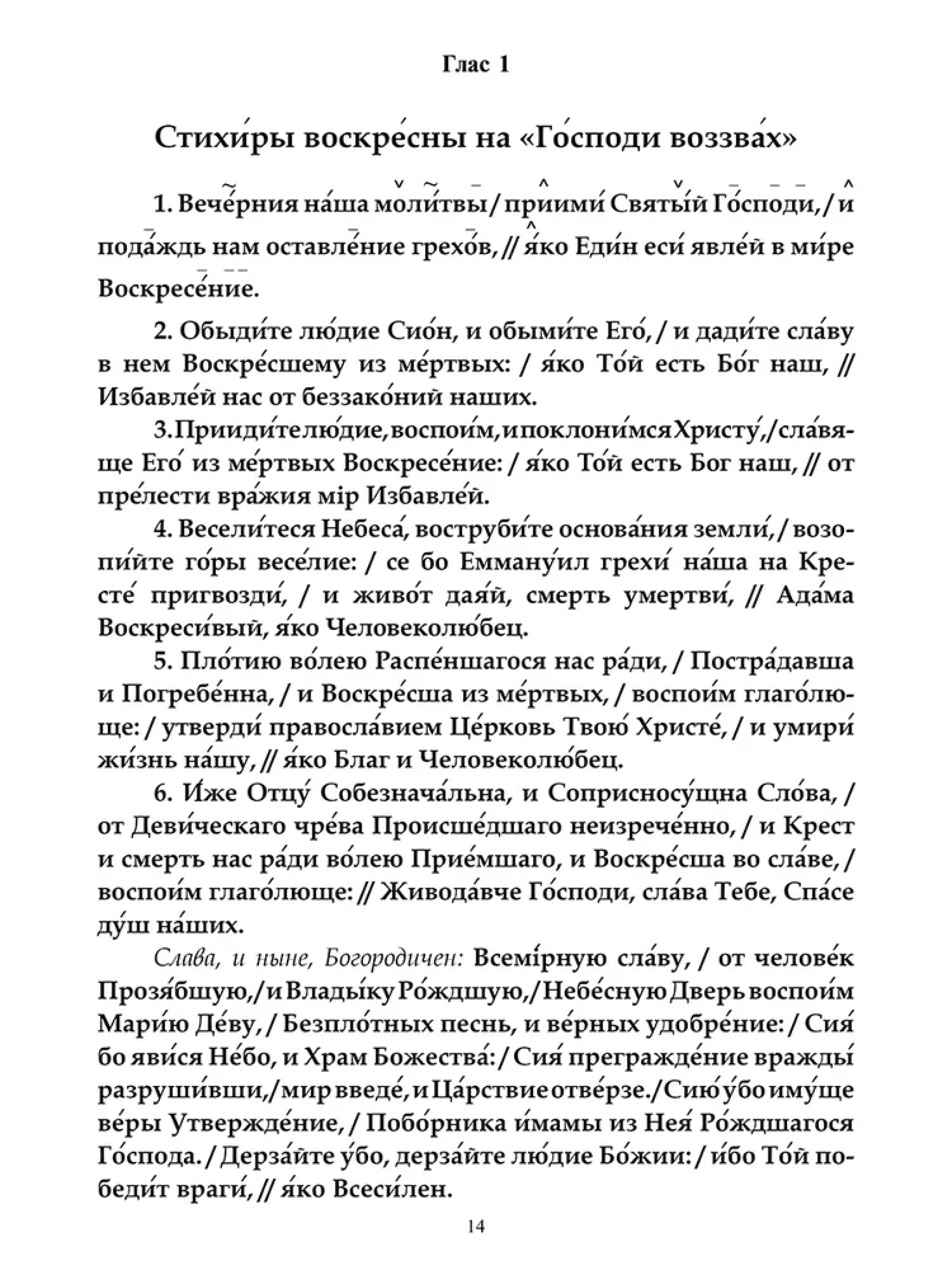 Пособие содержит образцы современных гласовых напевов московской традиции. Сборник предназначен как для употребления на богослужении в качестве памятки гласовых напевов, так и для изучения их на специальных уроках «Церковного обихода» в качестве пособия.