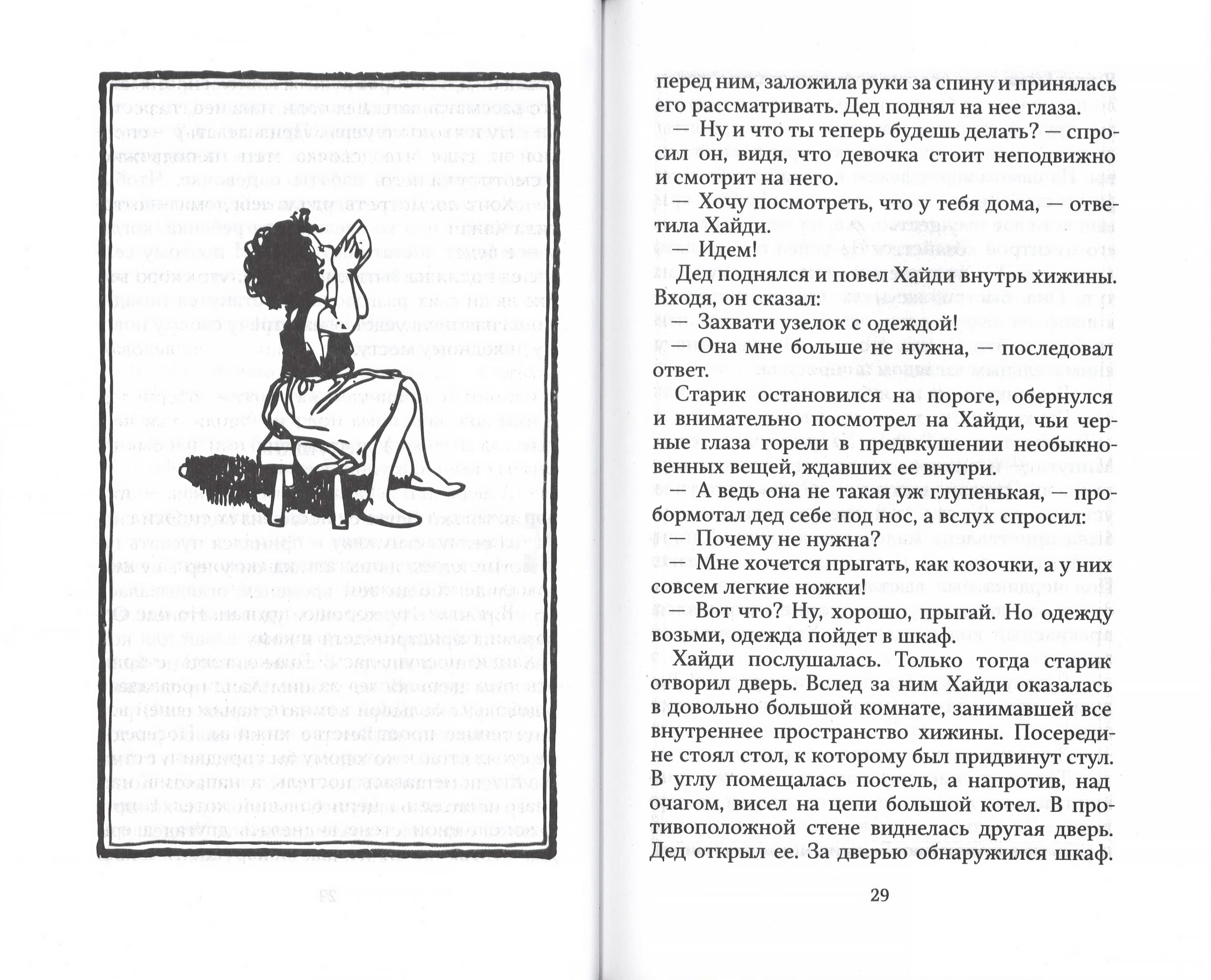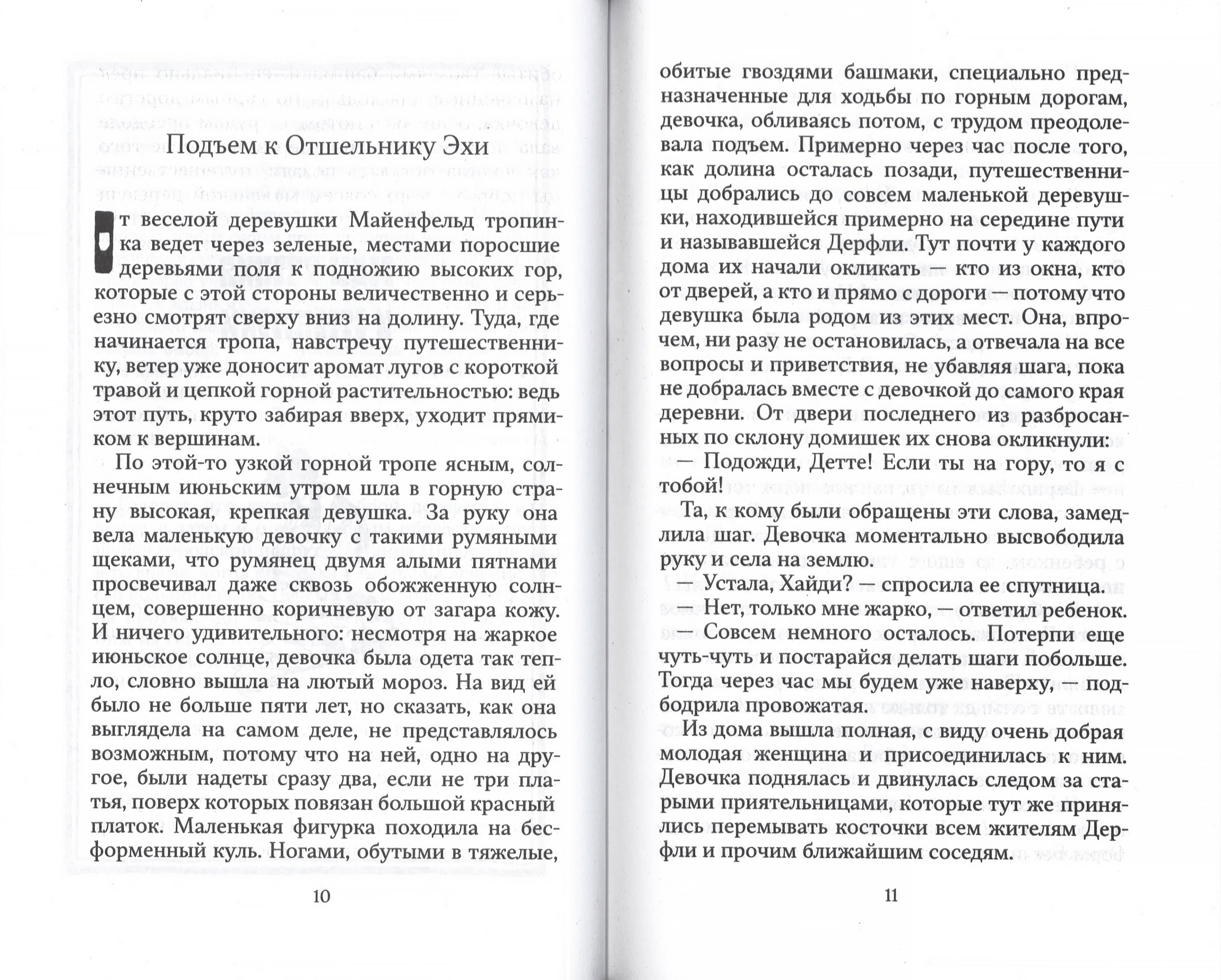 Щеки у Хайди всегда румяные, ведь она пьет козье молоко, спит на сеновале и дни напролет бродит по горам вместе со своим закадычным другом — пастушком Петером. Хайди заботится о дедушке, а еще она умеет колоть дрова и прибираться в доме. Эта девчушка — как солнышко, она озаряет ярким светом жизнь людей, с которыми встречается и дарит им радость.