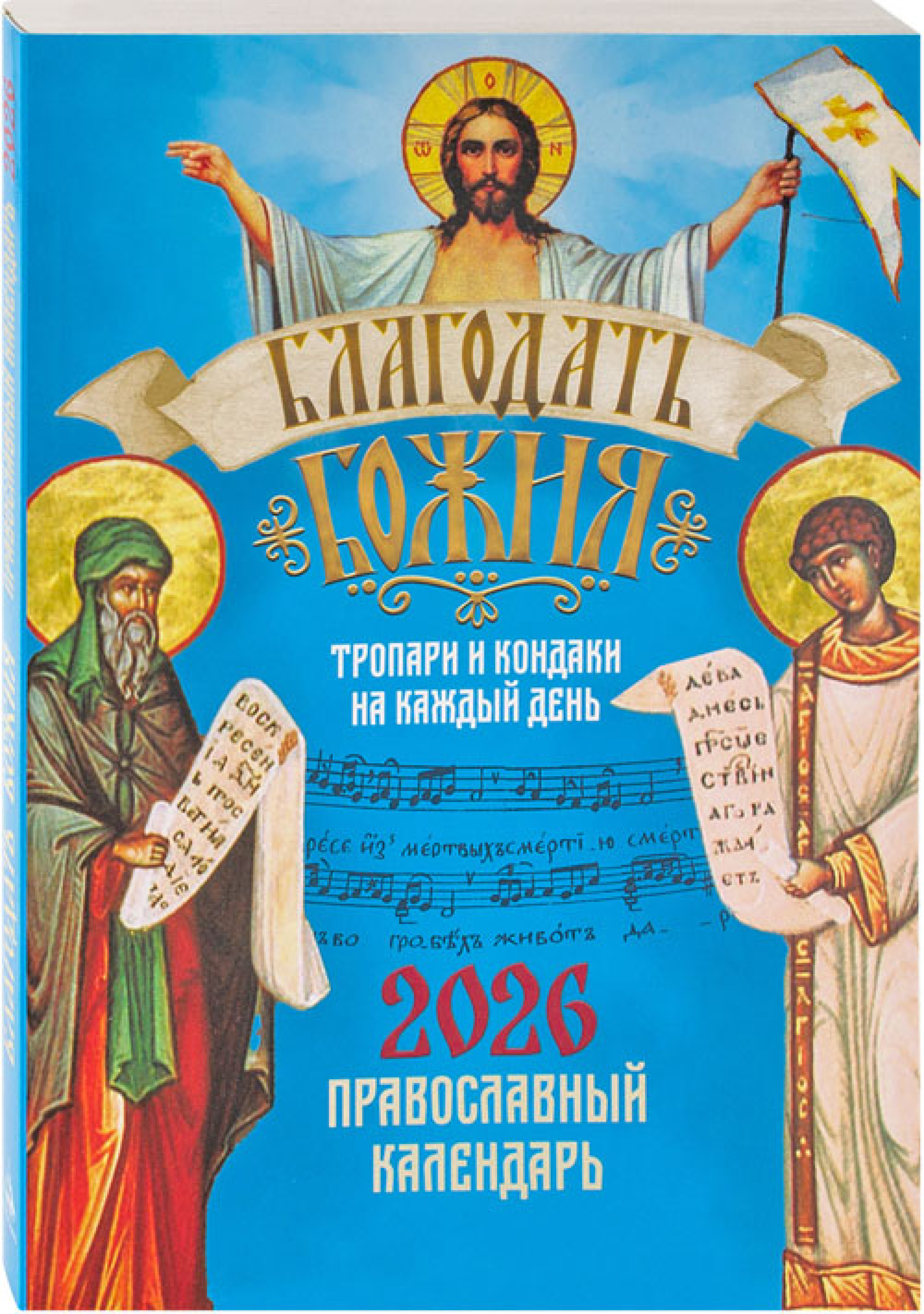 Православный календарь с тропарями и кондаками «Благодать Божия» на 2026 год содержит сведения обо всех церковных праздниках, а также днях памяти святых и чтимых икон Божией Матери на каждый день церковного года. Также в этом календаре приводятся указатель чтений из Священного Писания и тексты тропарей и кондаков, посвященных Господским и Богородичным праздникам и избранным святым.