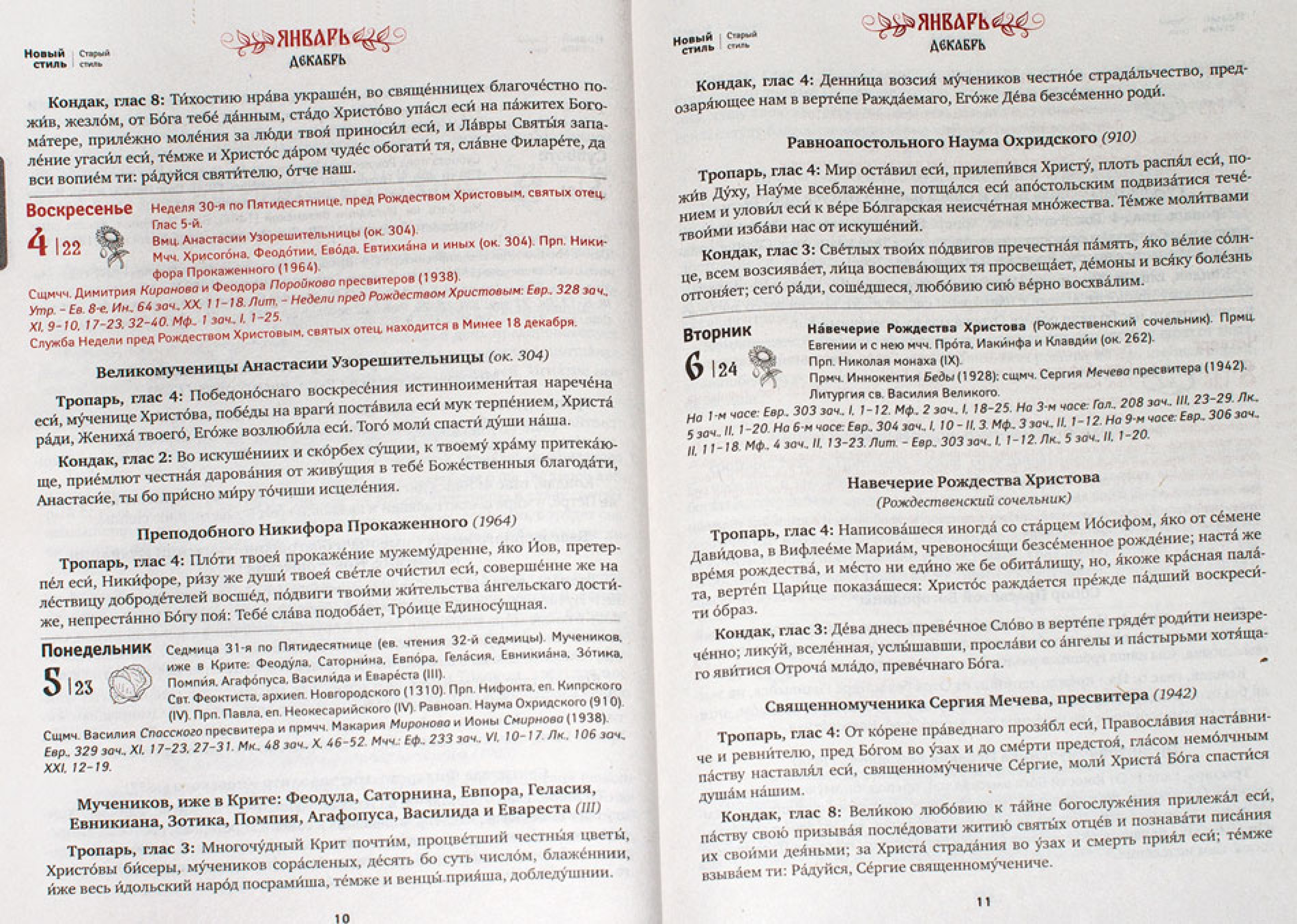 В данном календаре шрифт набран в два цвета, с помощью указателей месяцев можно быстро перейти на нужный фрагмент, а условные обозначения легко ориентируют в постовых указаниях на конкретный день.