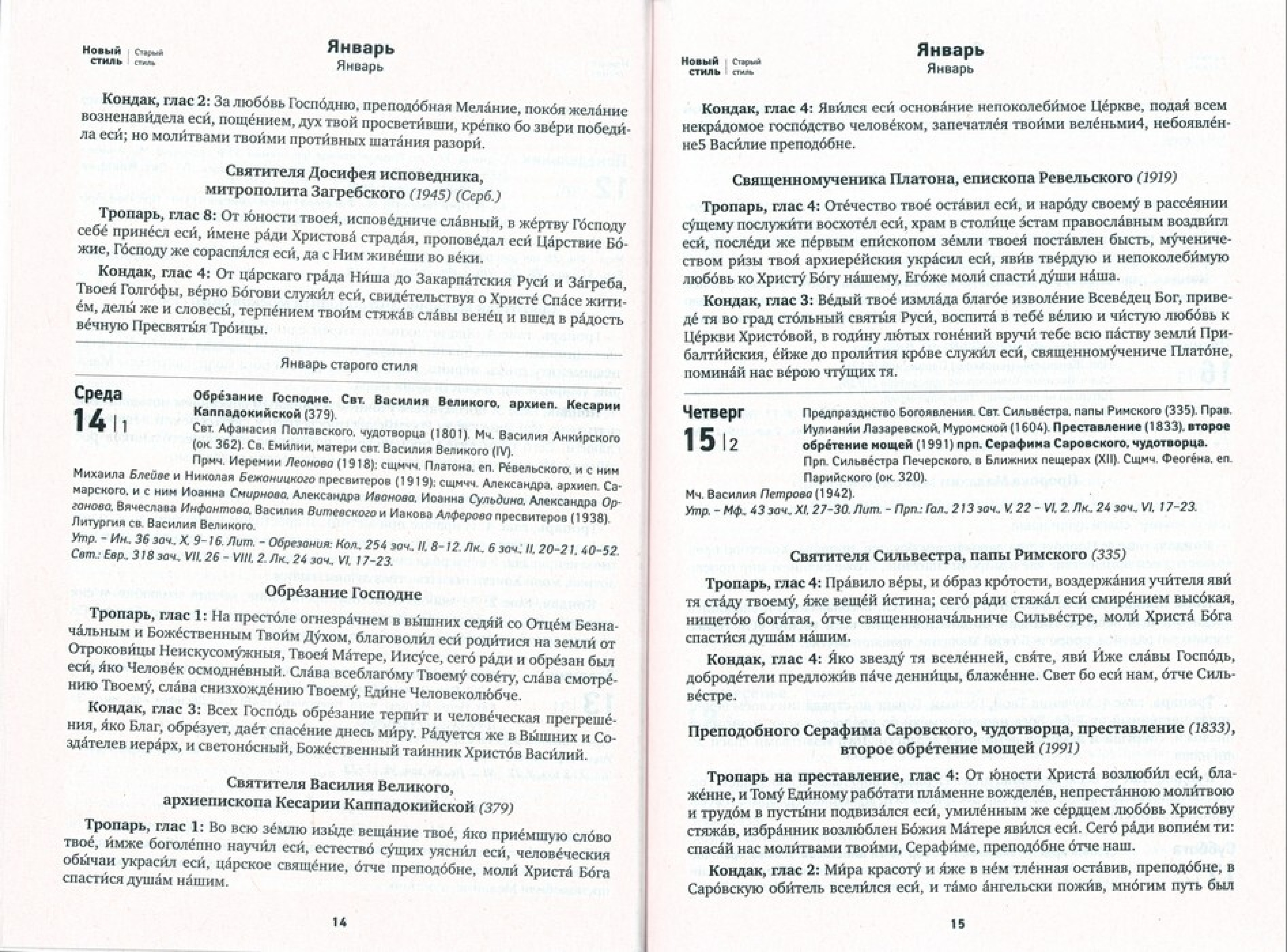 Также в этом календаре приводятся указатель чтений из Священного Писания и тексты тропарей и кондаков, посвященных Господским и Богородичным праздникам и избранным святым.
