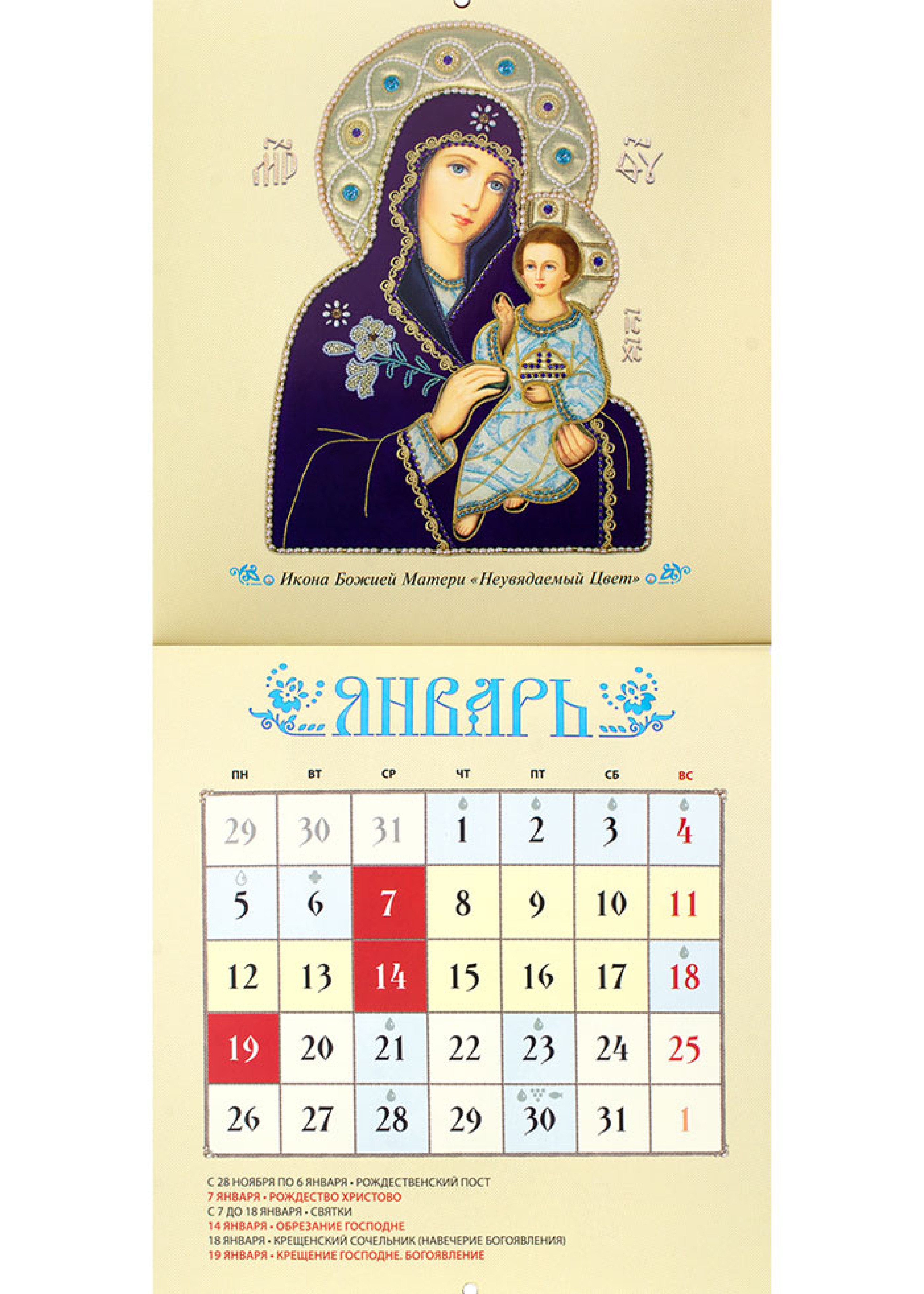 В календаре изображены иконы в окладе ручной работы, выполненные в мастерской Свято-Елисаветинского монастыря г. Минска.