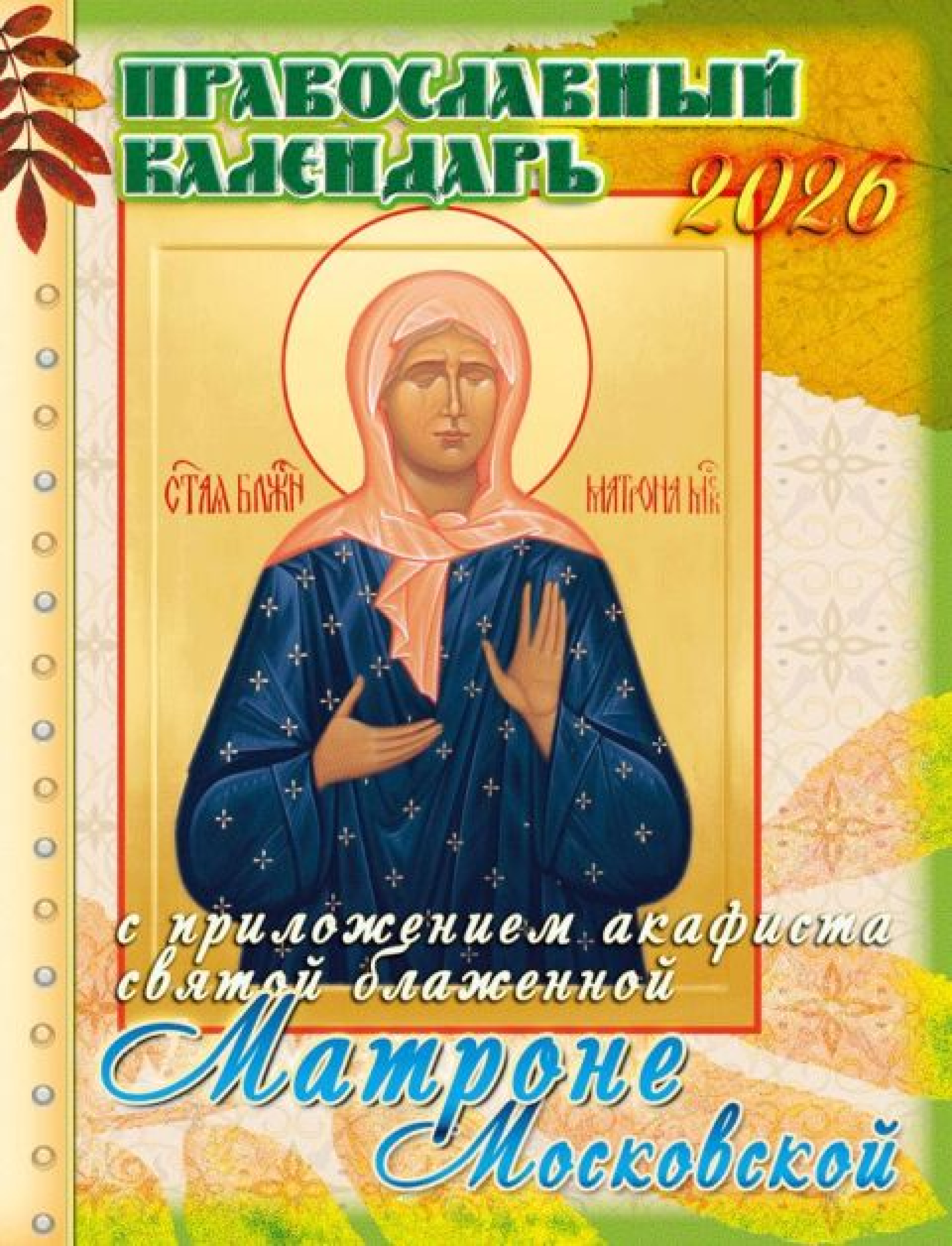 Православный церковный календарь на 2026 год с приложением, в котором представлен акафист святой блаженной Матроне Московской, а также ее краткое житие.