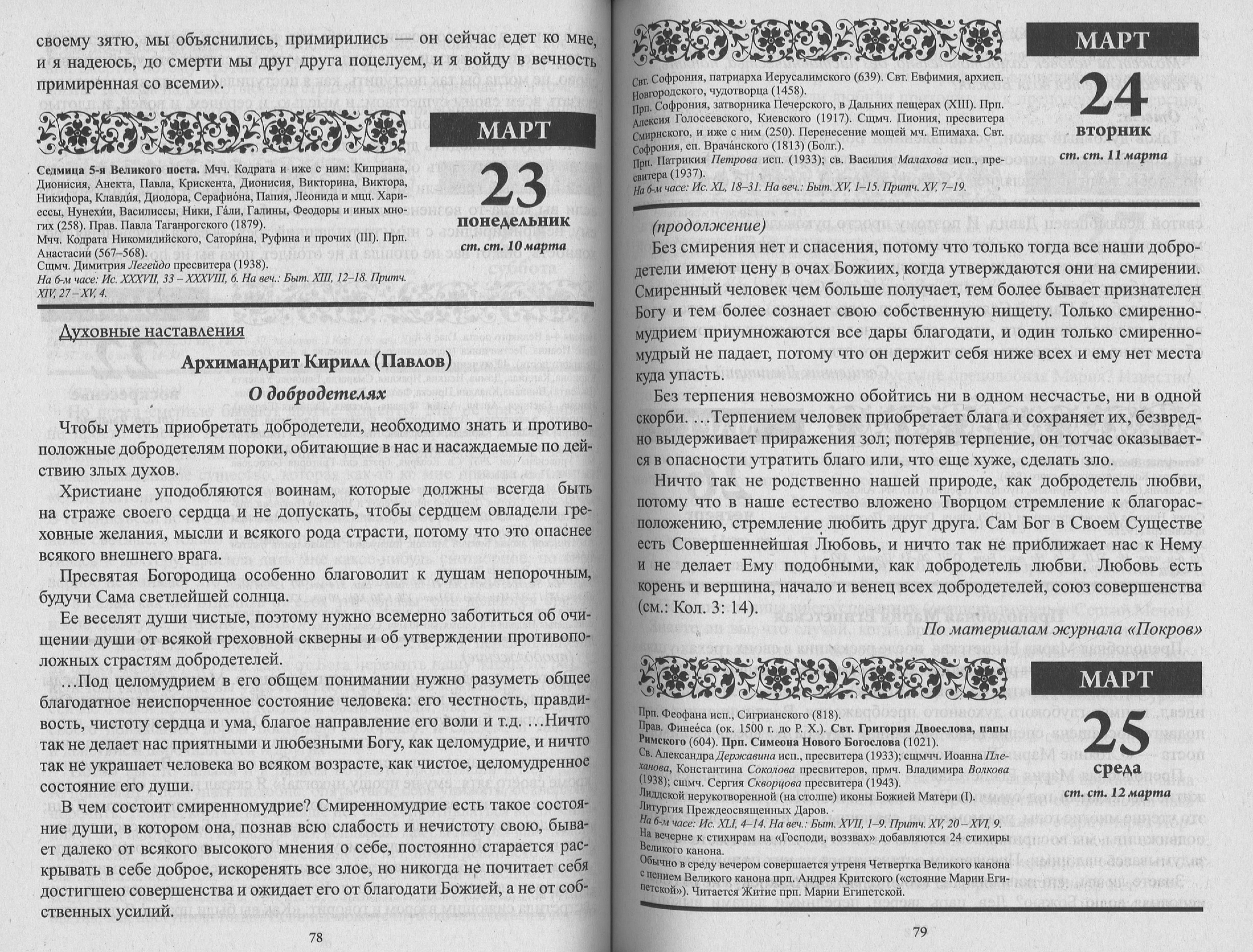 Традиционно календарь содержит молитвы к прославленным Церковью старцам и основные богослужебные тексты в дни церковных праздников.