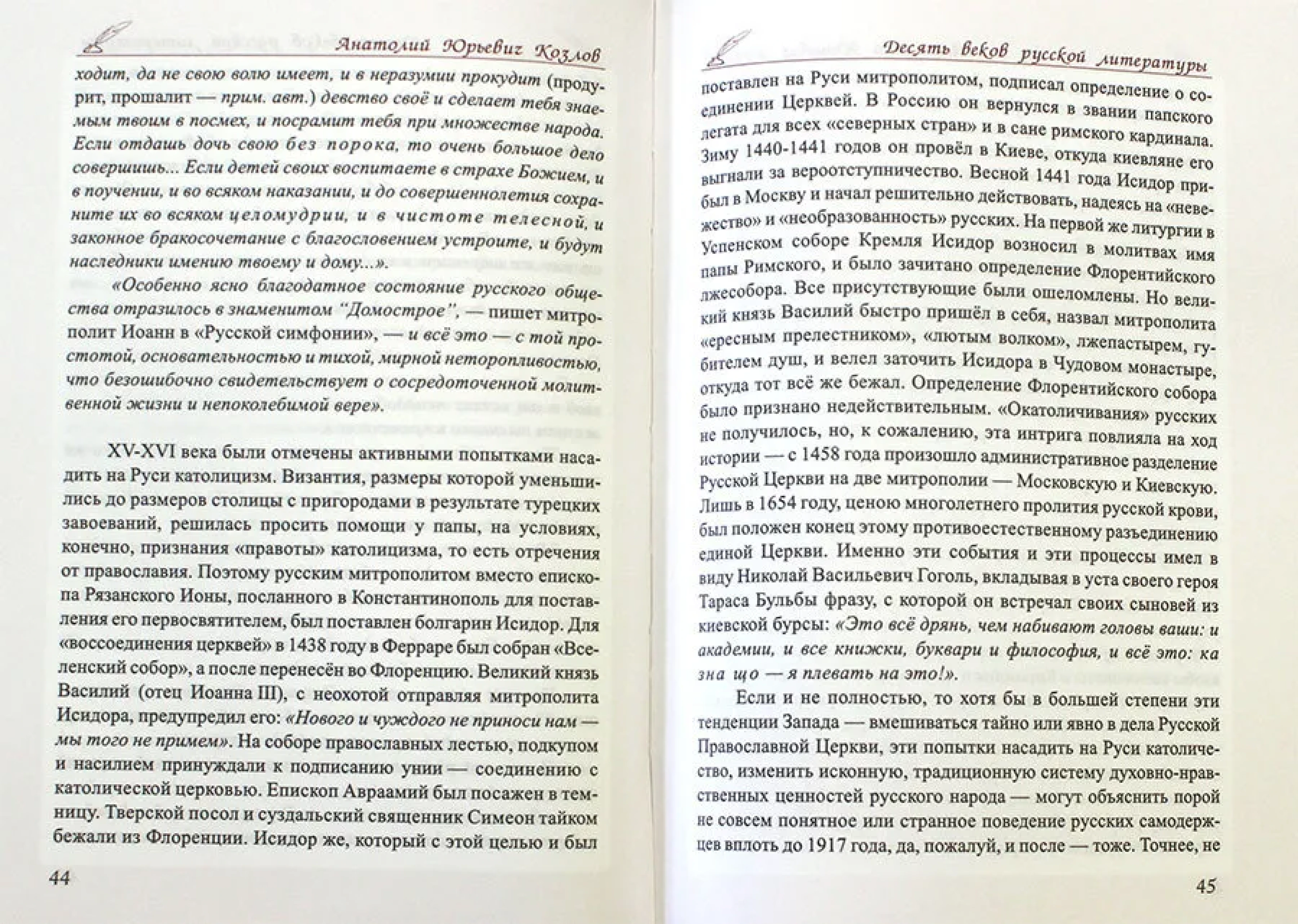 Любые попытки изучения истории России вне контекста Православия обречены на неудачу. Подтверждение тому — русская литература: для атеиста смысл написанного верующим писателем остается вне поля понимания. Анализ, проведенный А.Ю. Козловым, заставляет совершенно по-новому взглянуть на творчество многих русских поэтов и писателей. Даже литература советского периода, оказывается, пронизана идеями Православия. И А.Ю. Козлов поясняет: иначе и быть не может, если писатель чувствует в себе духовные корни. А корни русской литературы всегда питало Православие.