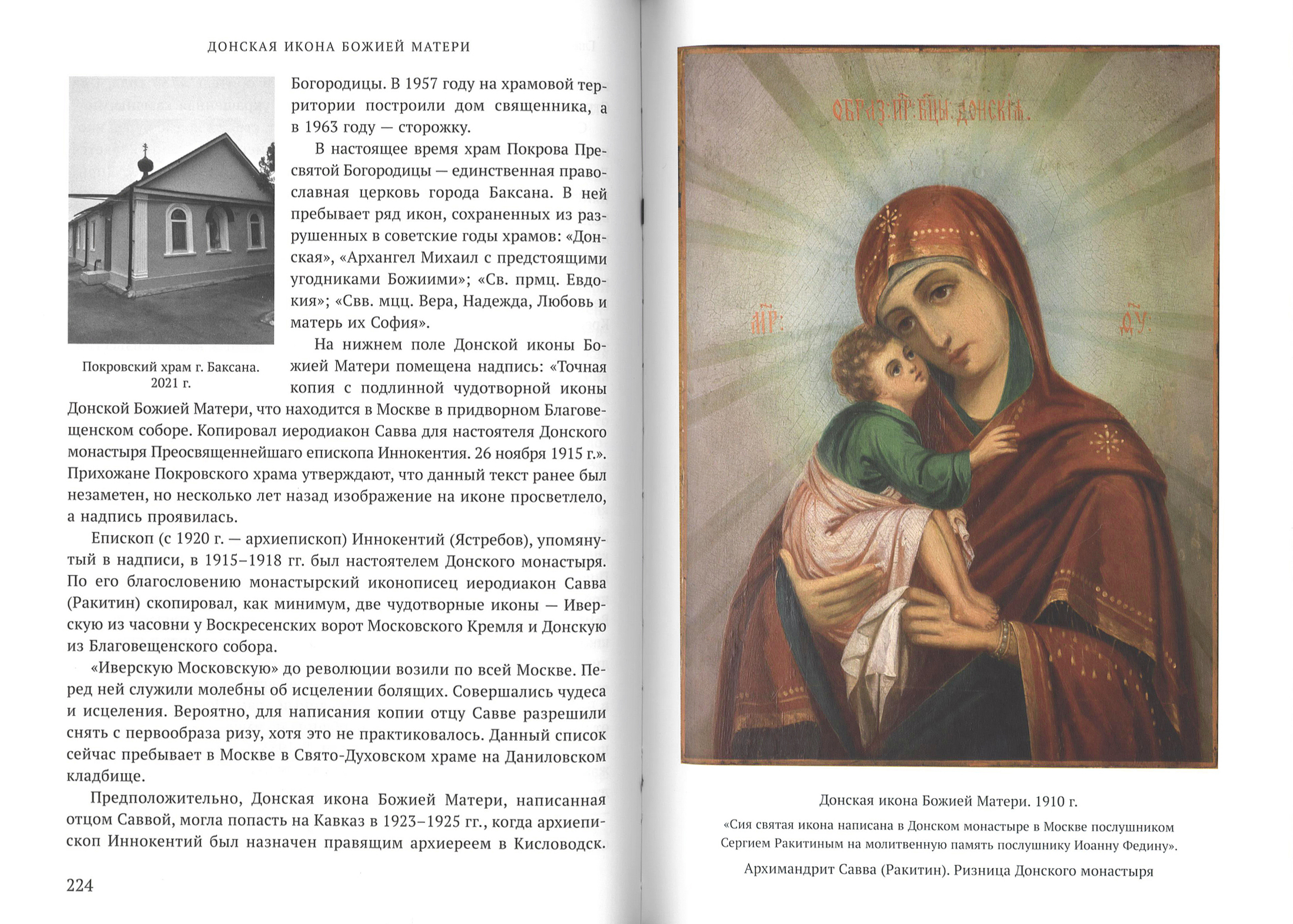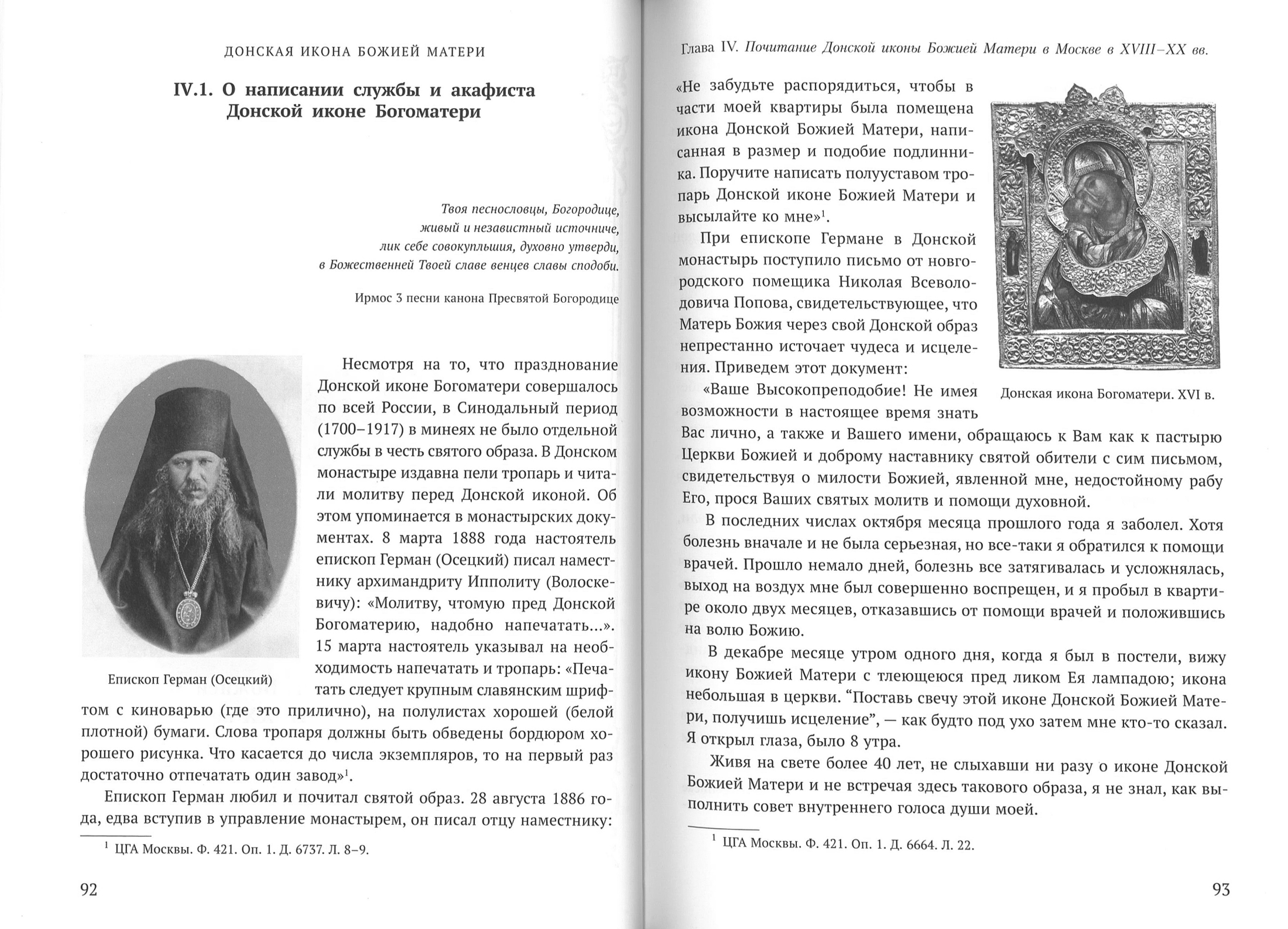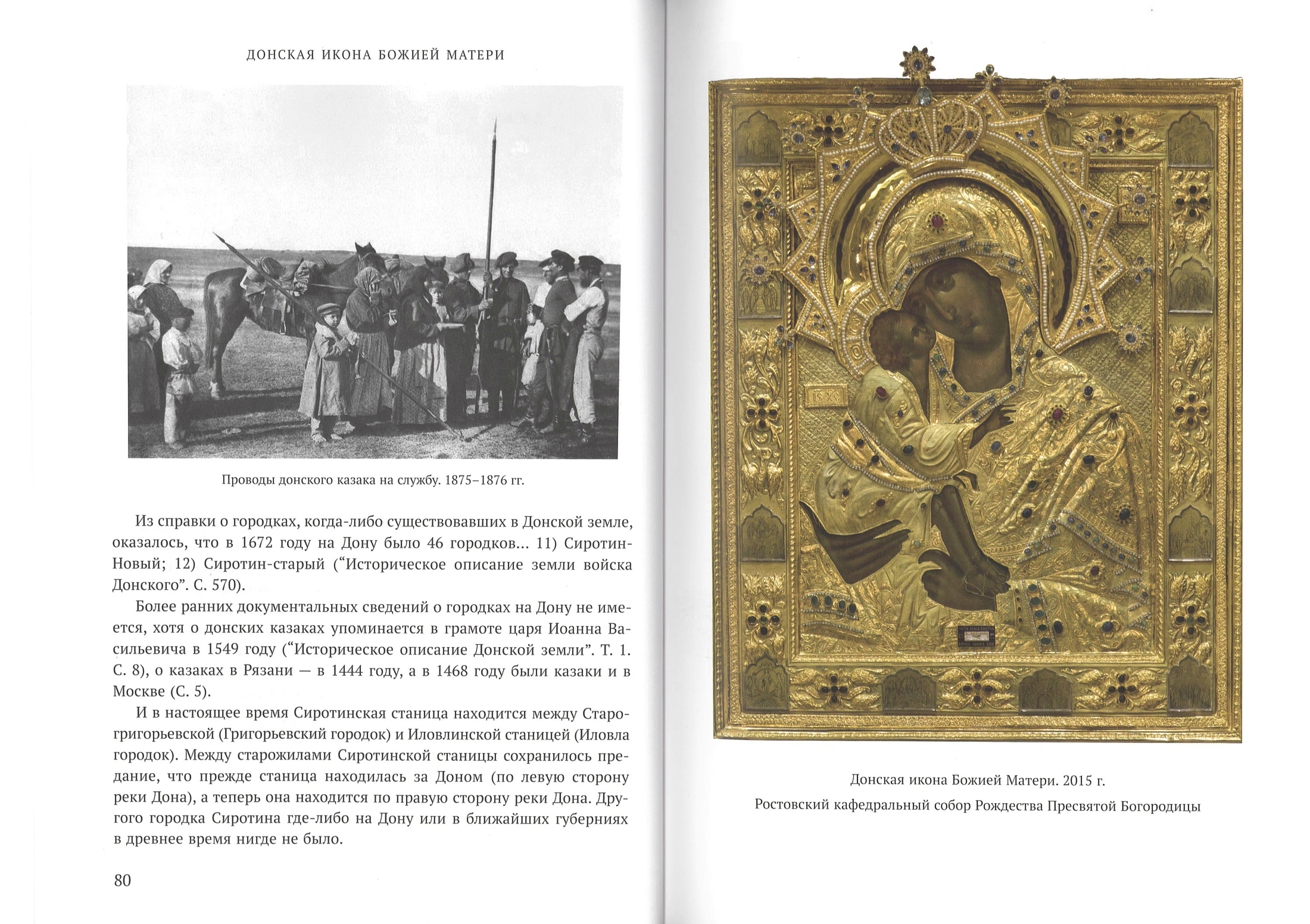 Приводится описание художественных и стилистических особенностей списков с Донской иконы Богоматери, хранящихся в храмах, монастырях и музеях России, и явленных через них чудес. Особое внимание уделено храмовому празднику московского Донского монастыря 19 августа / 1 сентября и ежегодному крестному ходу в обитель в XVI-XX веках. Рассказывается о почитании Донского образа Божией Матери донским казачеством.