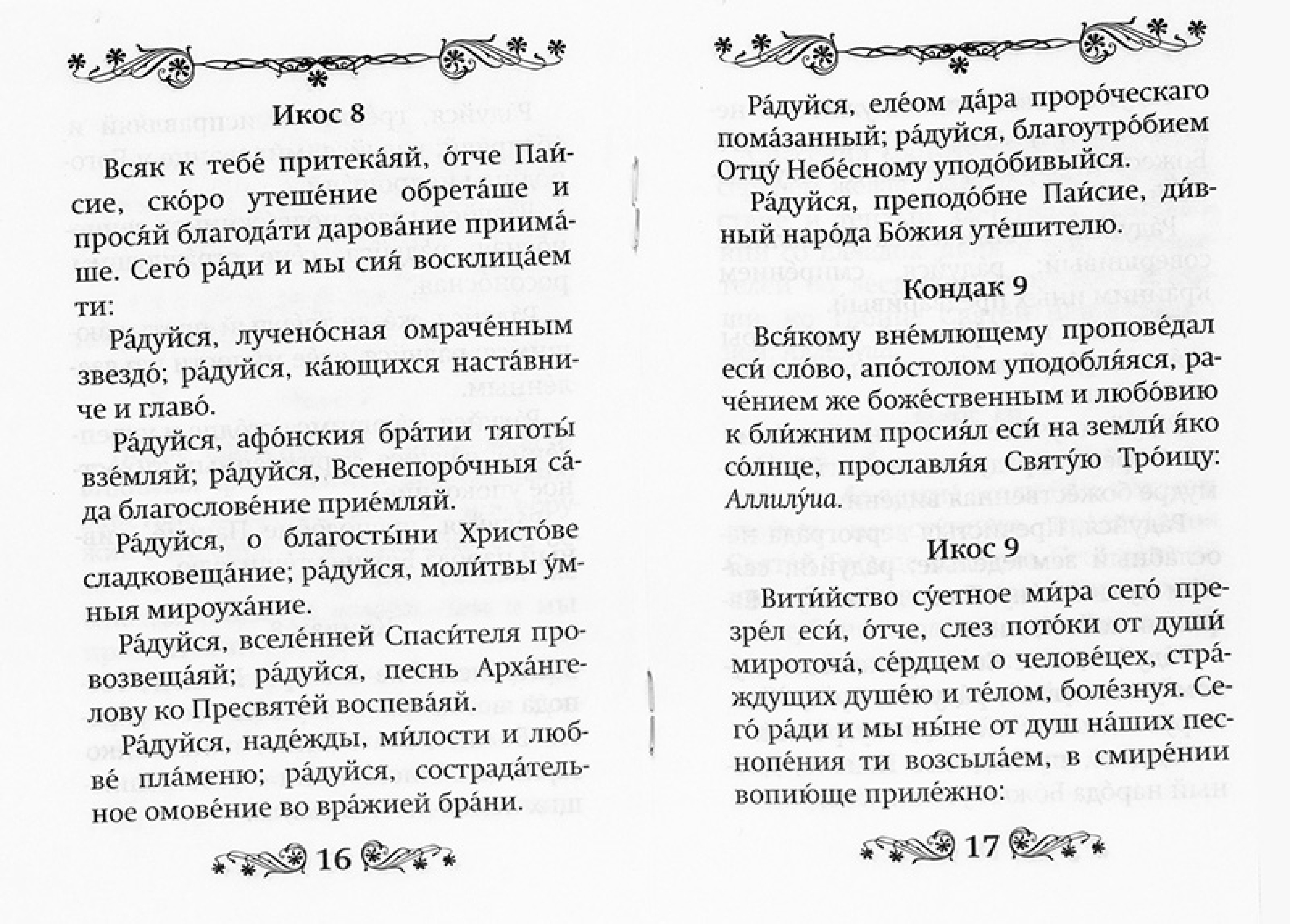 Издание содержит текст акафиста известному преподобному греческому старцу 20 века Паисию Святогорцу, утвержденный для употребления за богослужением и в домашней молитве на заседании Священного Синода 25 июля 2024 года, в гражданской (русской) орфографии, с ударениями.Год издания: 2024