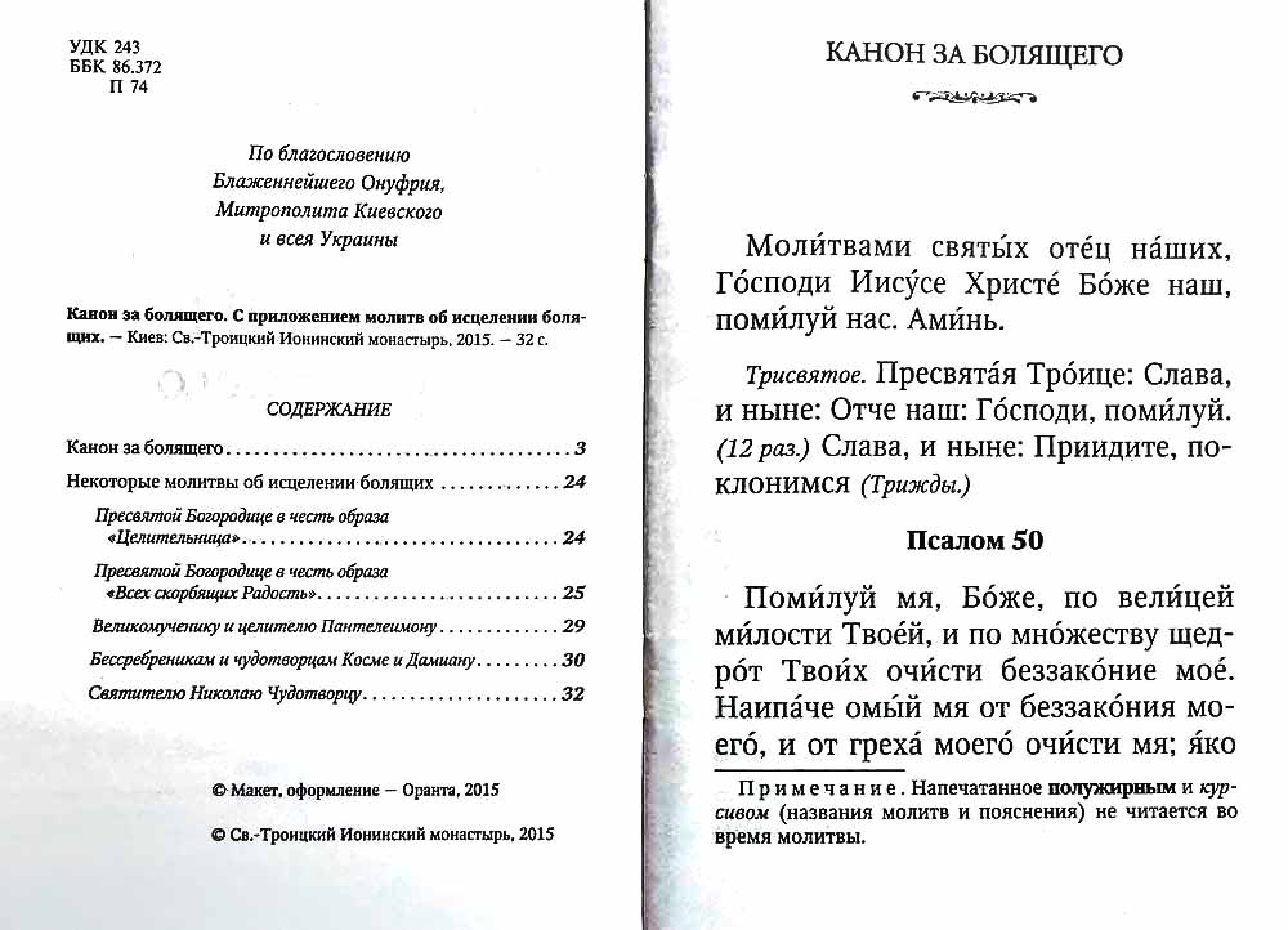 Издание содержит Канон за болящего и некоторые молитвы об исцелении.