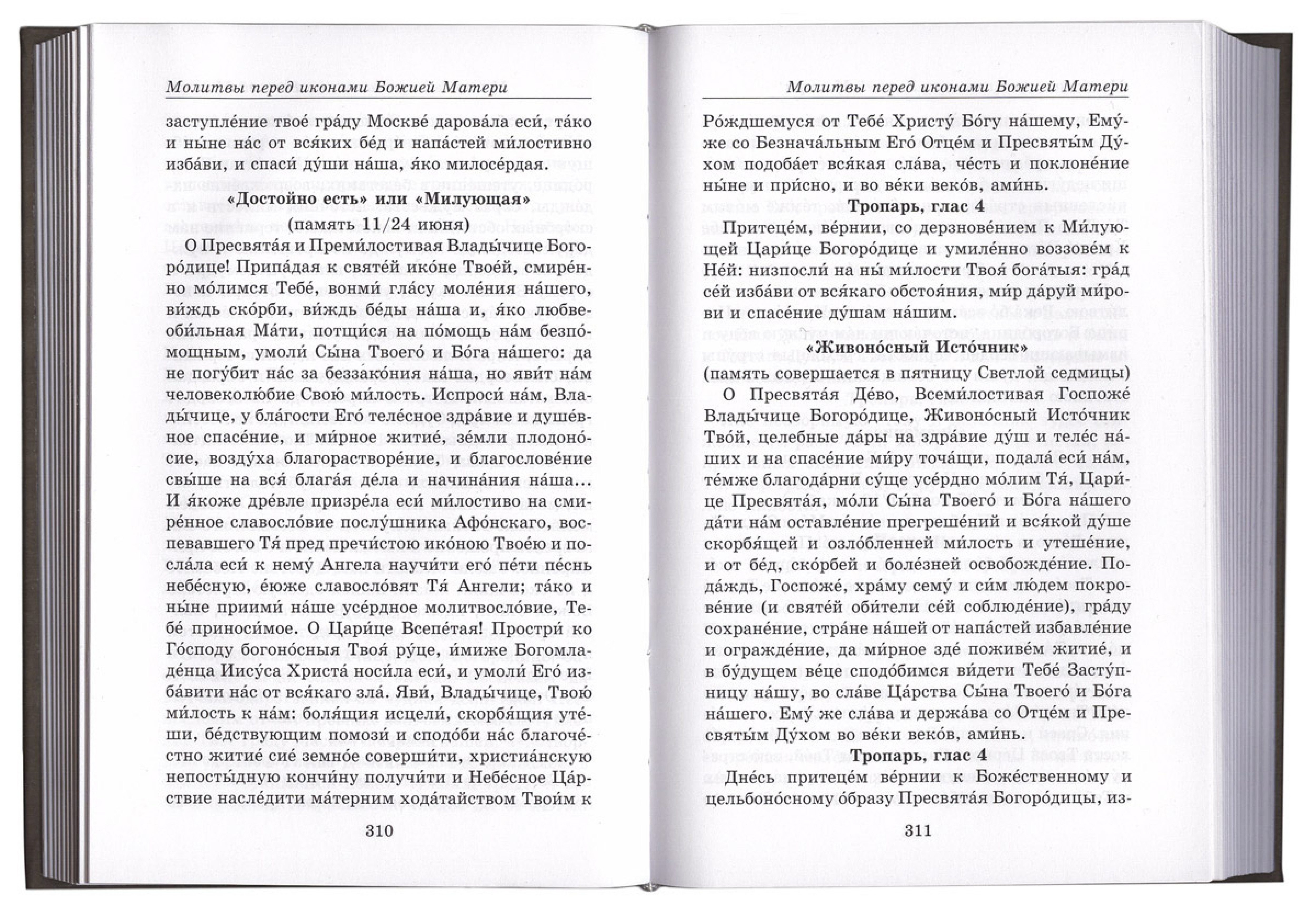 Также помещены последования основных богослужений Православной Церкви, молитвы перед чтимыми иконами Божией Матери, а также молитвы на всякую потребу – о детях, воинах, путешествующих и т.д.