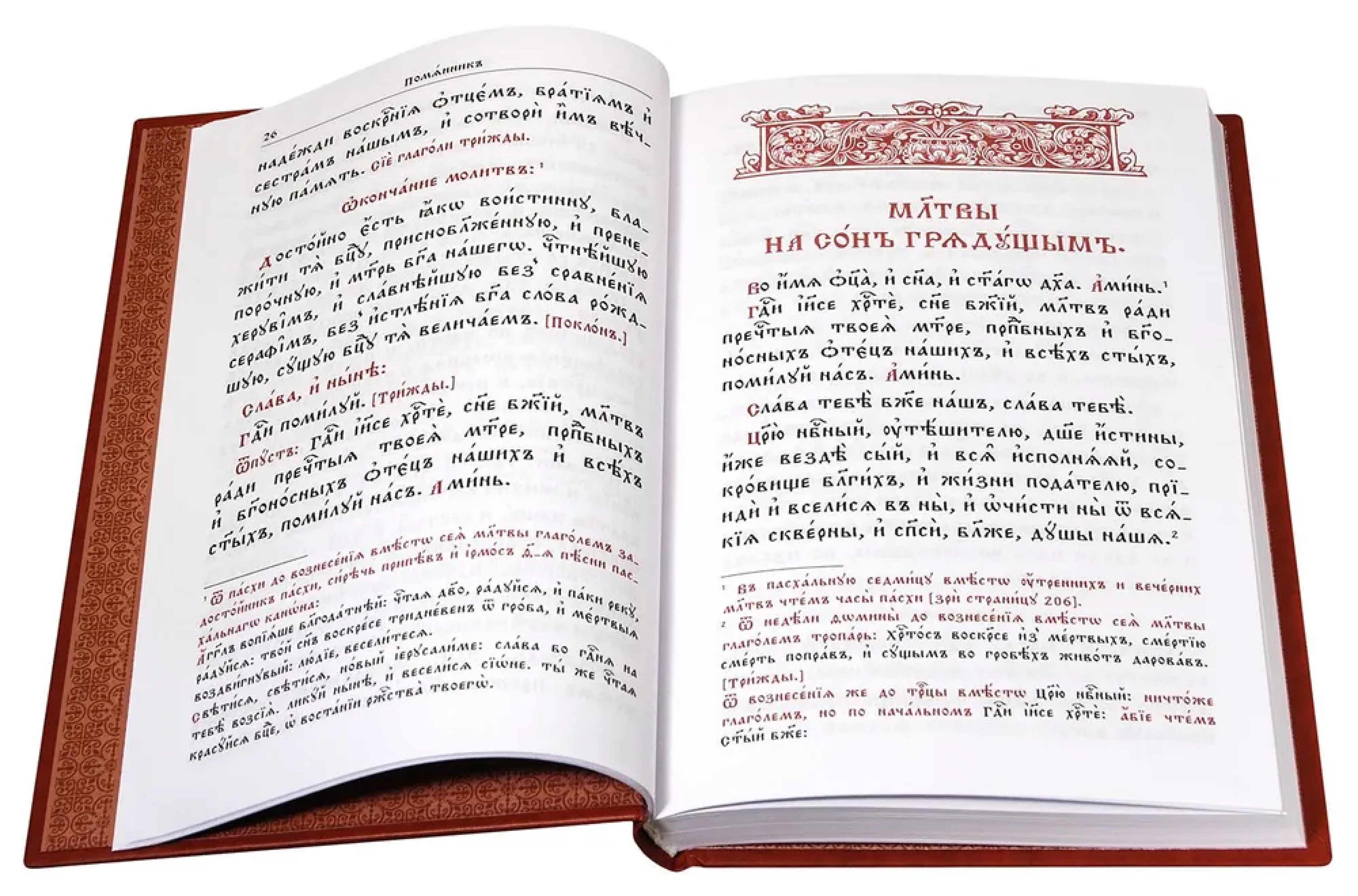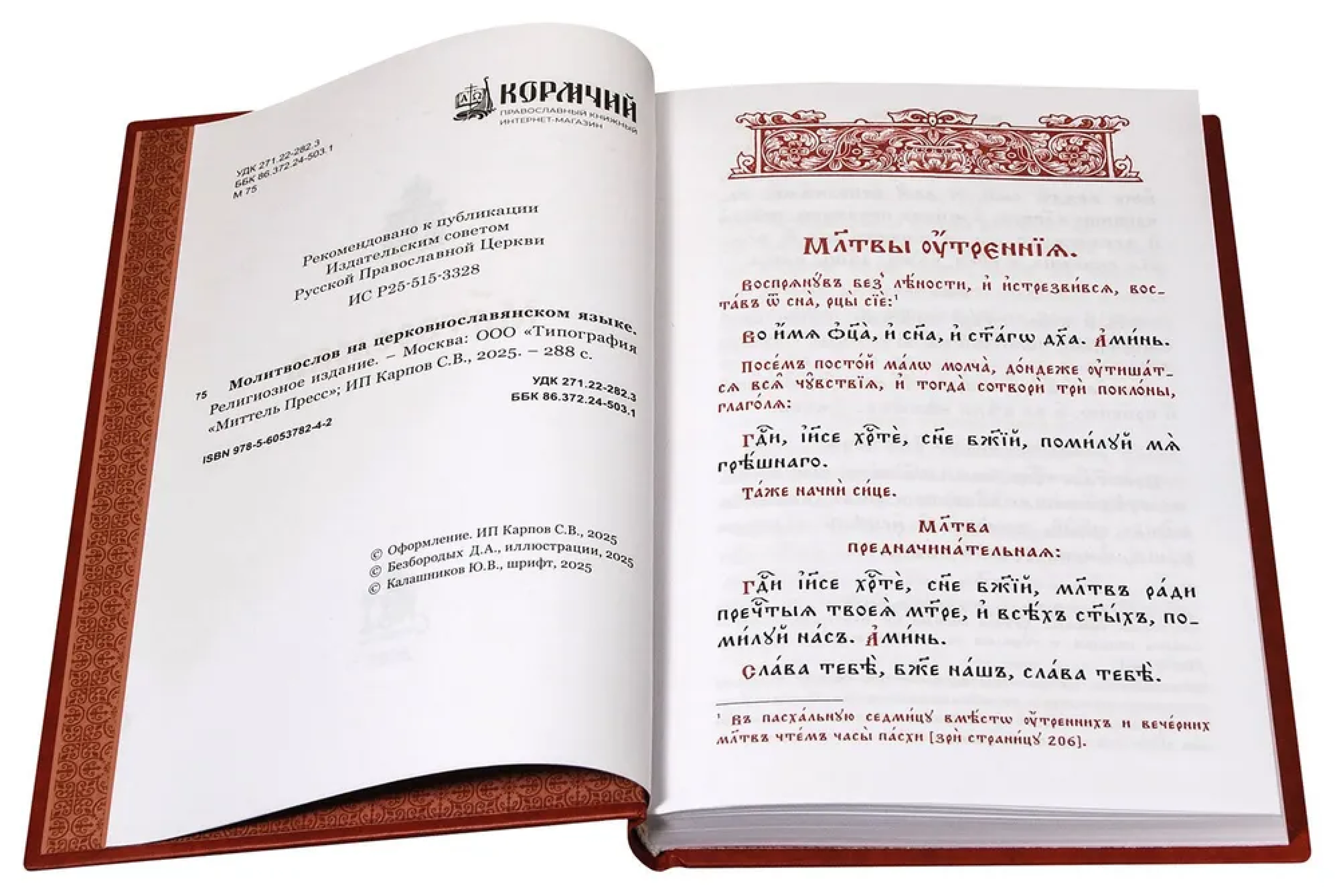 Молитвослов на церковнославянском языке, отпечатан на высококачественной белой офсетной бумаге двухцветным крупным шрифтом, в твёрдой обложке, покрытой объёмным лаком.