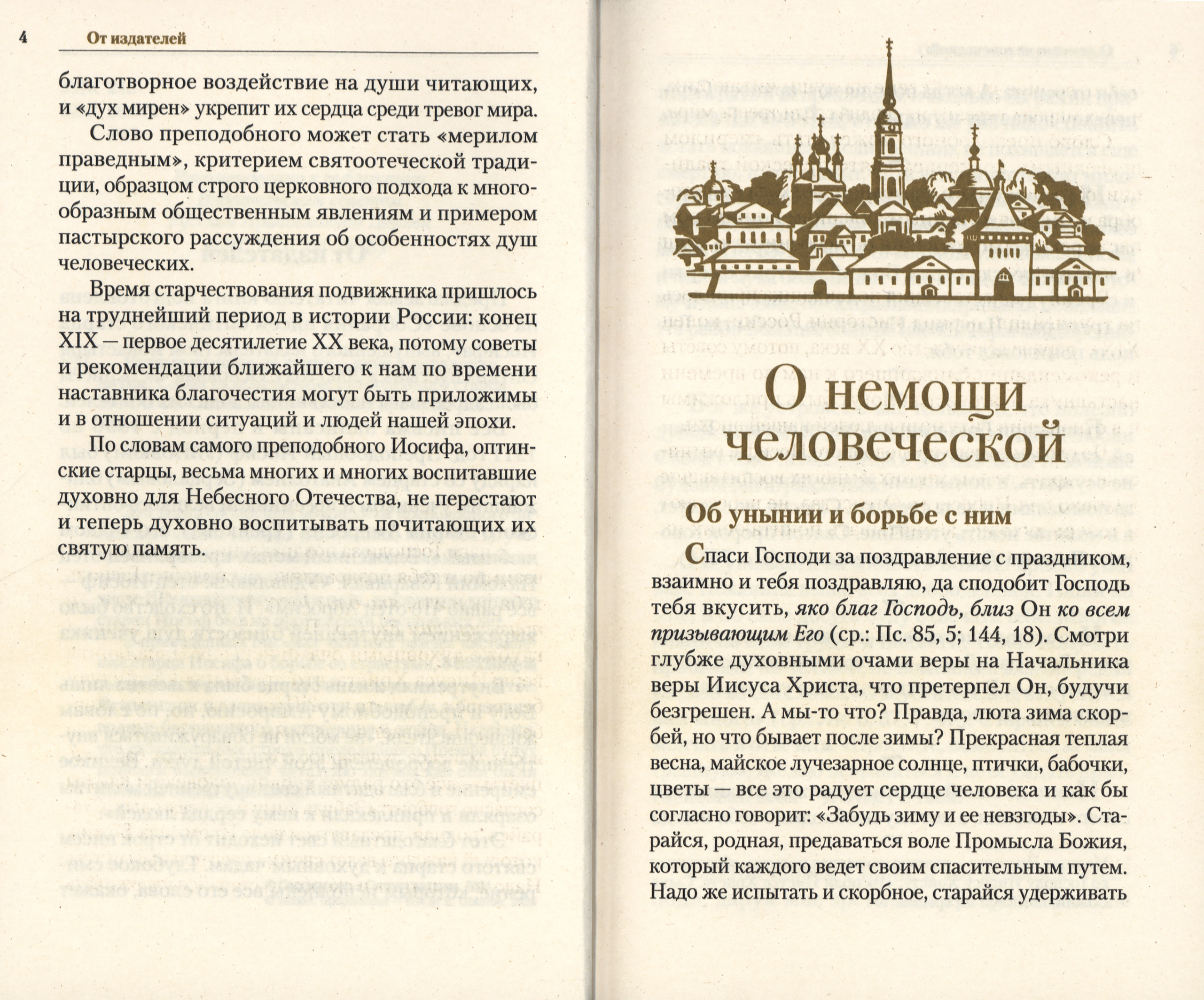 Преподобный Иосиф (Литовкин), наряду со старцем Анатолием (Зерцаловым), являлся ближайшим учеником и преемником великого оптинского старца Амвросия (Гренкова). Внутренняя жизнь его была известна лишь Богу и преподобному Амвросию, но, по словам жизнеописателя, «не могли не обнаруживаться внутренние добродетели этой чистой души. Великое смирение и благодатный свет внутренней молитвы озаряли и привлекали к нему сердца людей». Этот благодатный свет исходит от строк писем святого старца к духовным чадам. Глубокое смирение, которым исполнены его назидательные слова, окажет благотворное воздействие на души читающих и «дух мирен» укрепит их сердца среди тревог.