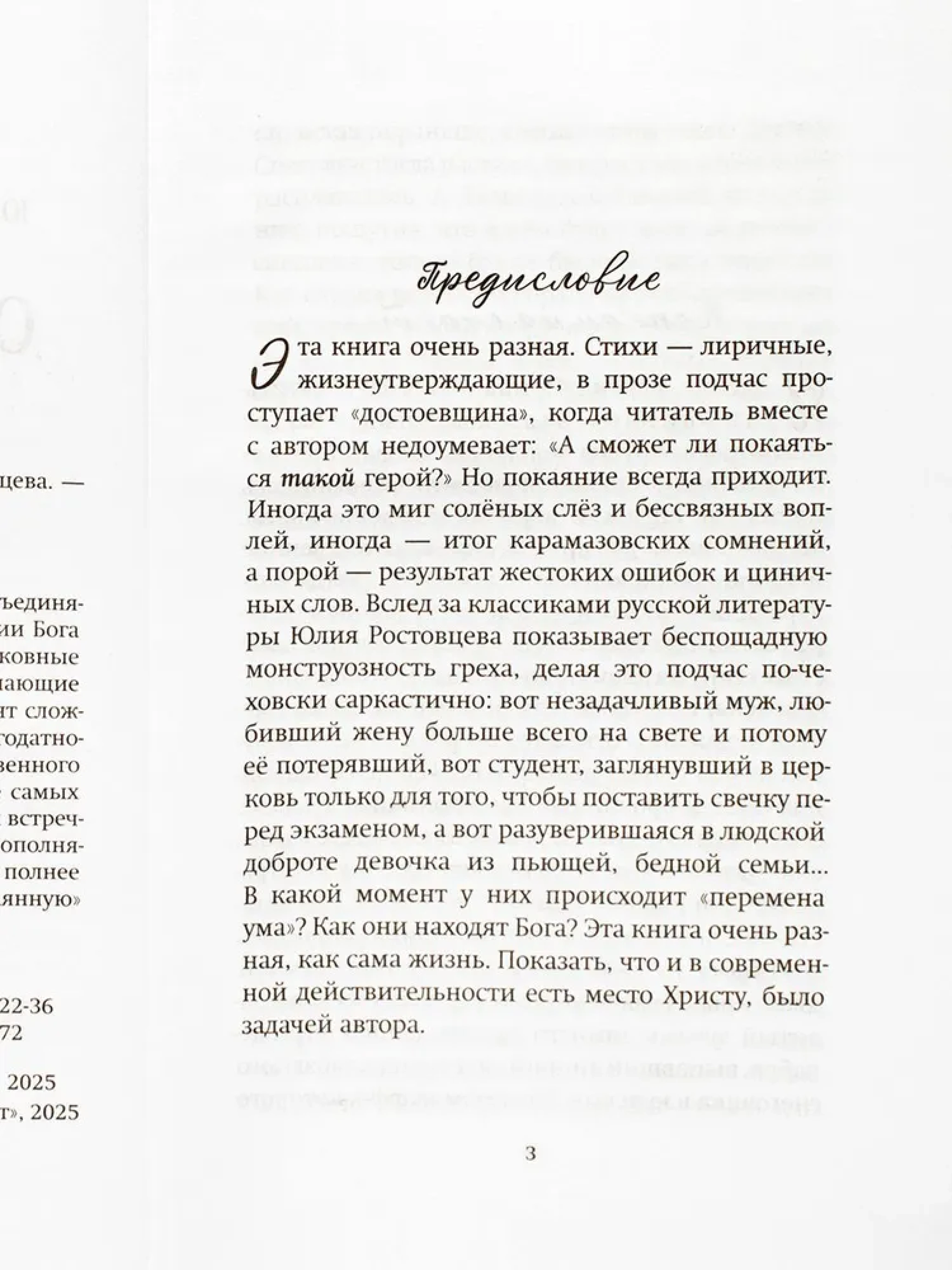 Рассказы и повести Юлии Ростовцевой объединяет самое главное – они о покаянии и обретении Бога современными людьми. Взрослые и дети, церковные служащие и неофиты, семейные пары и вступающие в брак — все герои этих произведений проходят сложный путь от греха и неверия до обретения благодатного Света. И в этом очевидно действие Божественного Промысла, когда Господь касается сердец даже самых злых и далеких от веры людей, и начинается их встречный путь к Небу, к своему спасению.