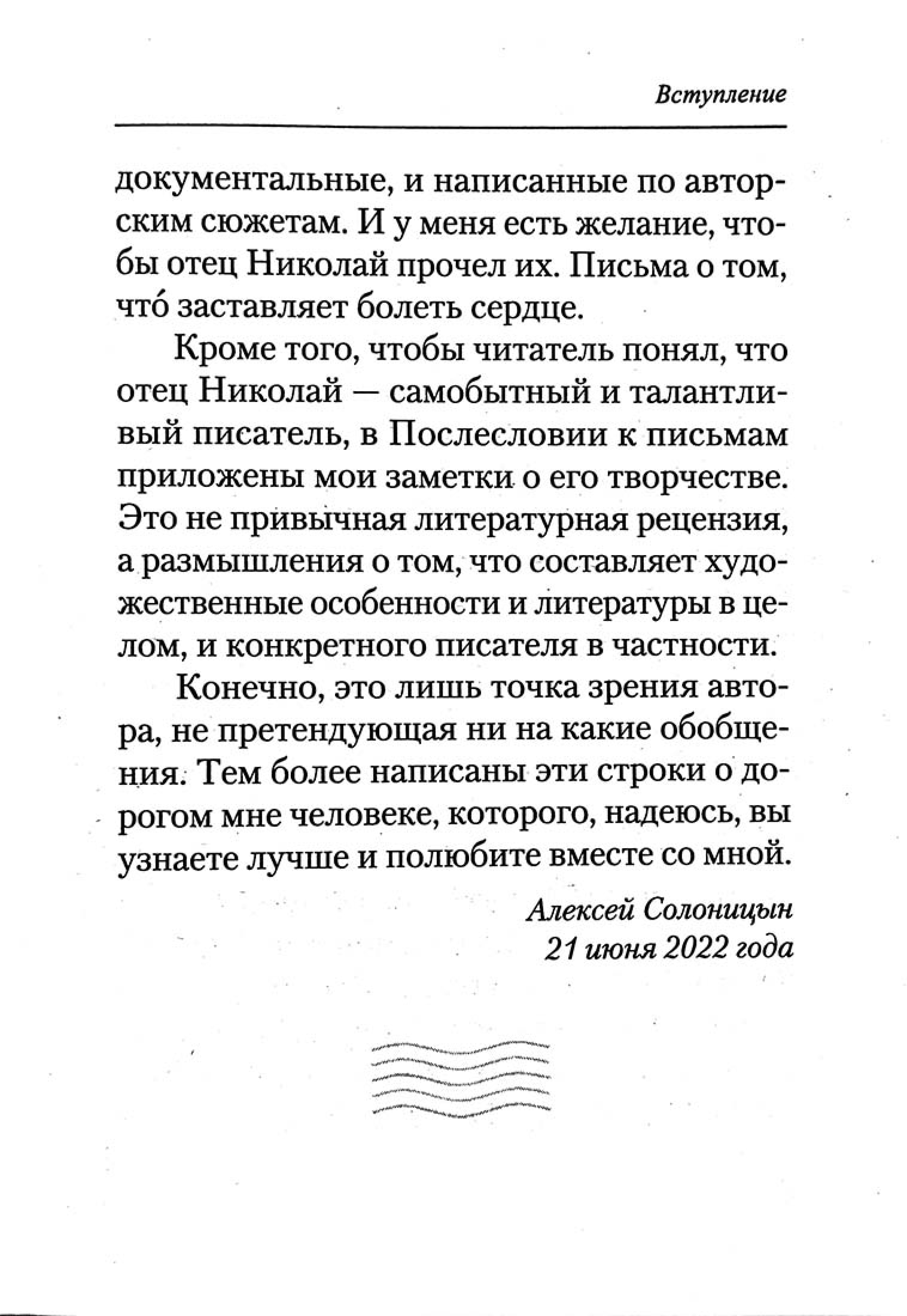 Эта книга — непрекращающийся диалог в письмах двух талантливых писателей. Чтобы читатель понял, что протоиерей Николай Агафонов — человек необыкновенный, в послесловии к книге ее автор, Алексей Алексеевич Солоницын, приложил свои заметки о творчестве дорогого друга и наставника.