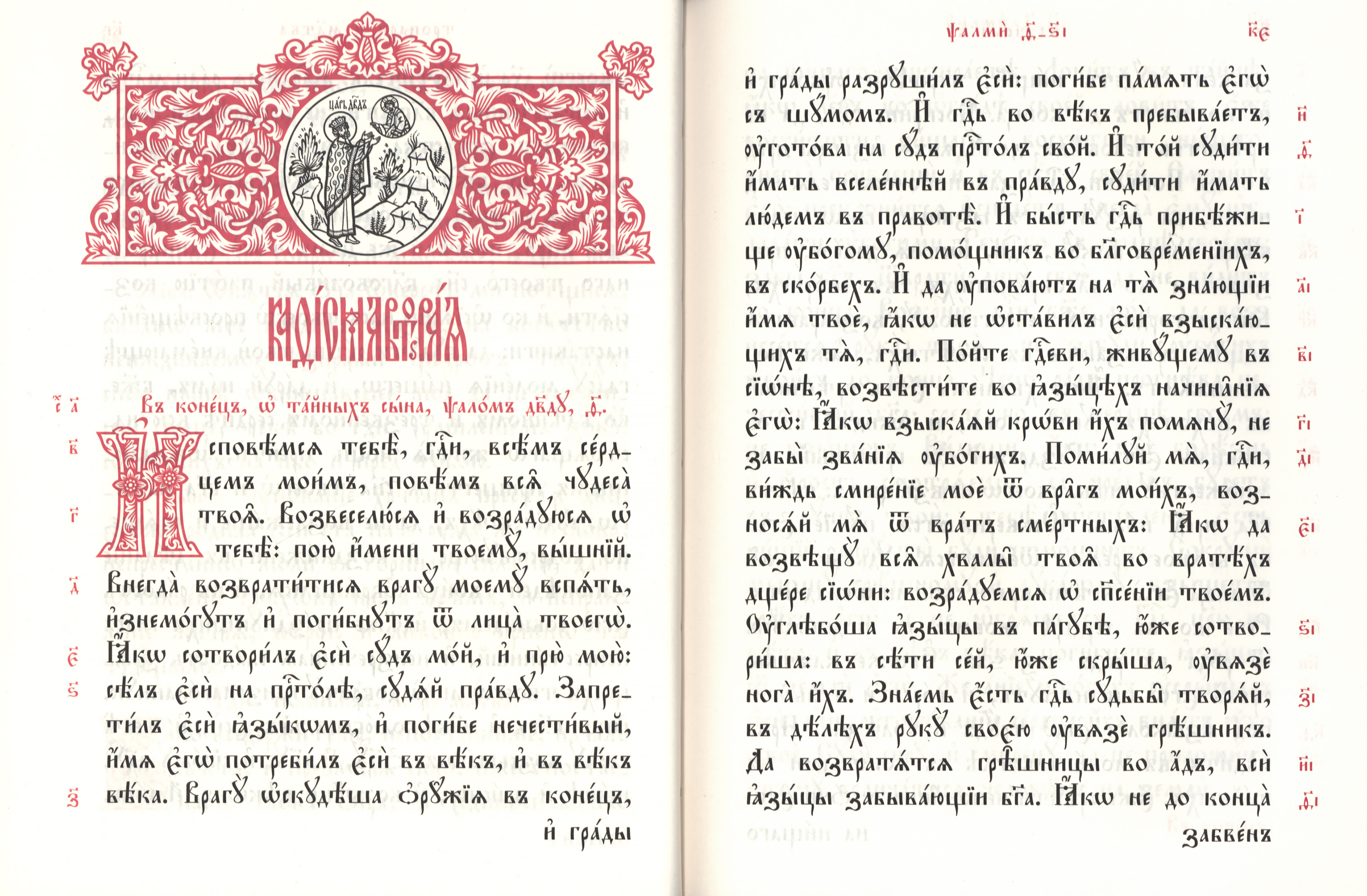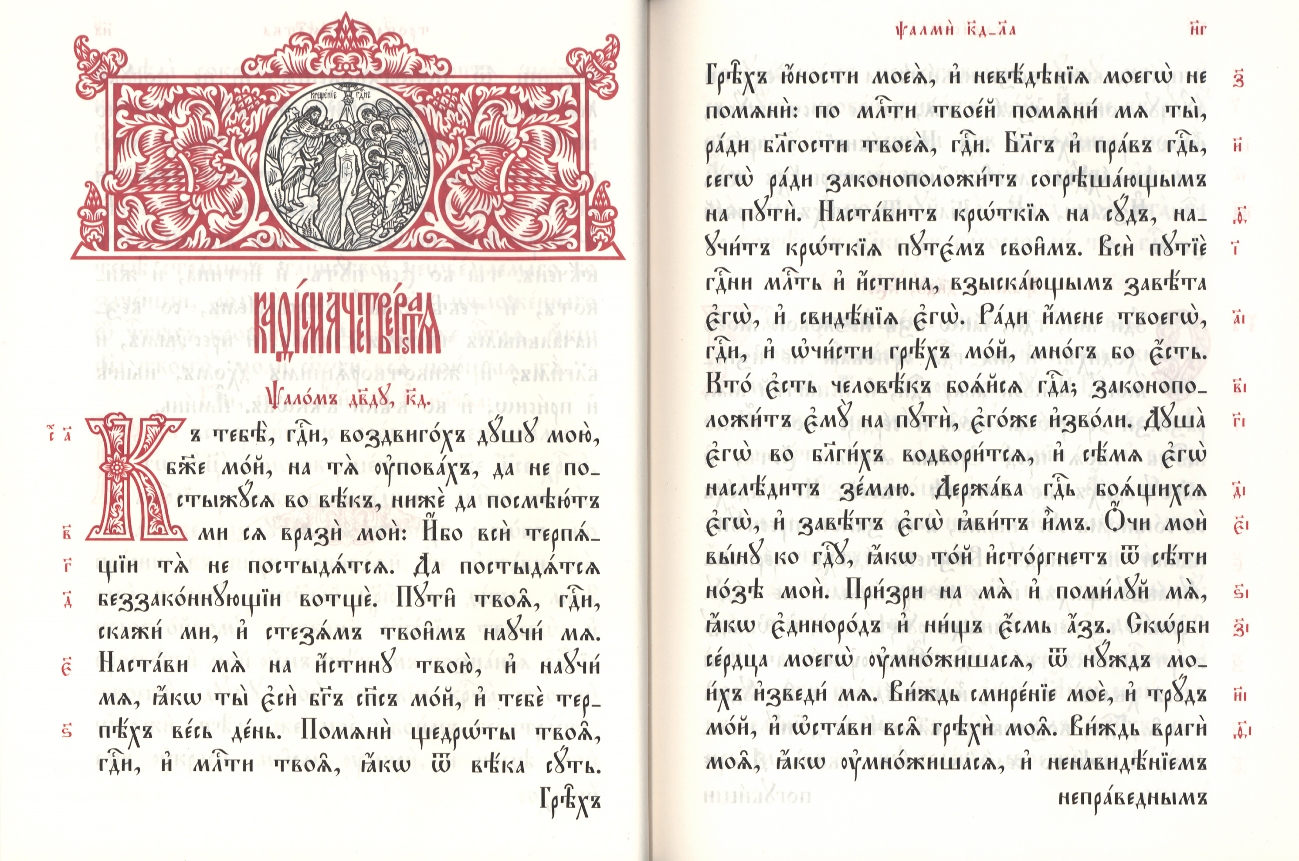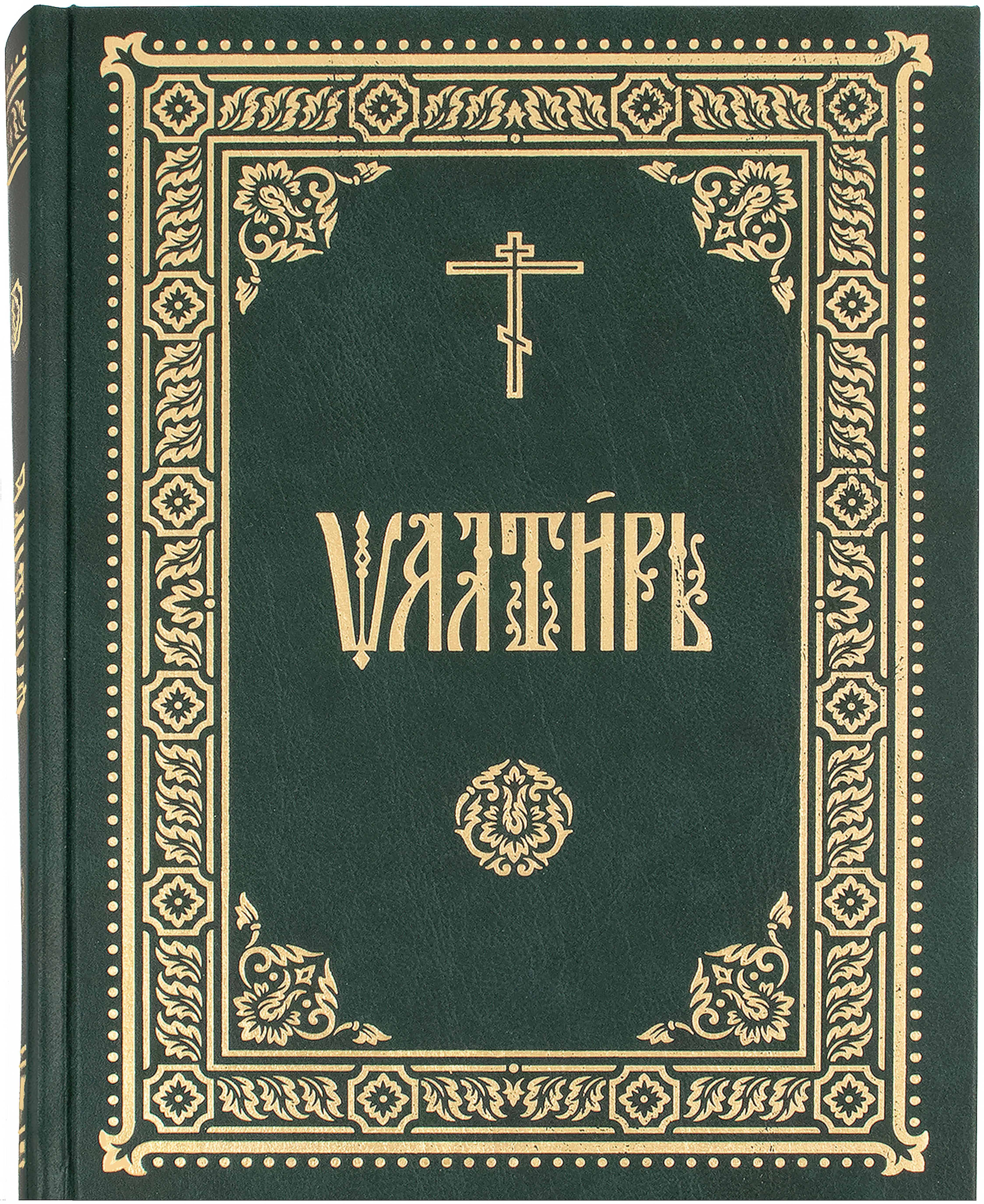 Псалтирь среднего формата, напечатанная в два цвета крупным церковно-славянским шрифтом на тонированной офсетной бумаге, представлена в твердом переплете с тиснением золотой фольгой.