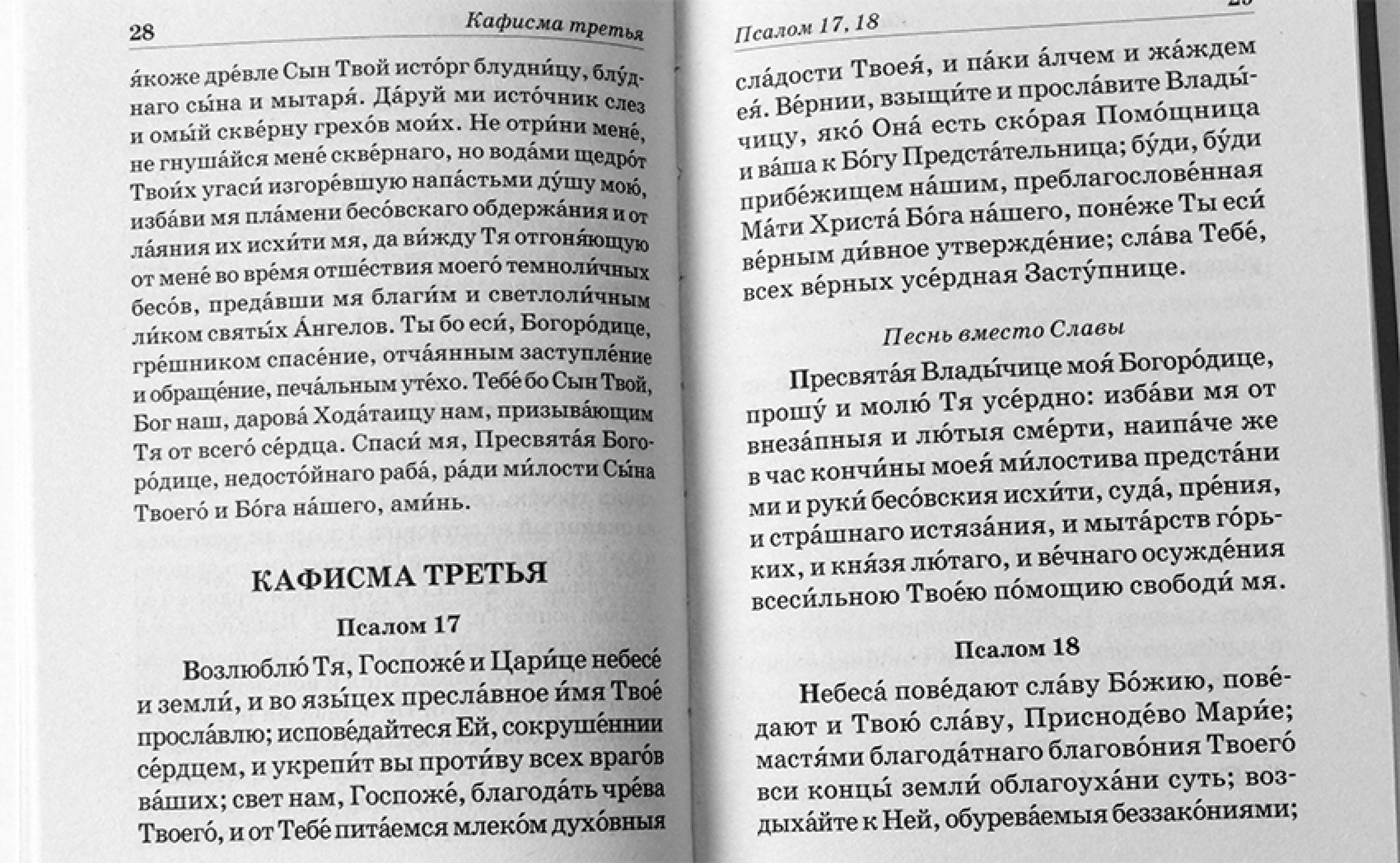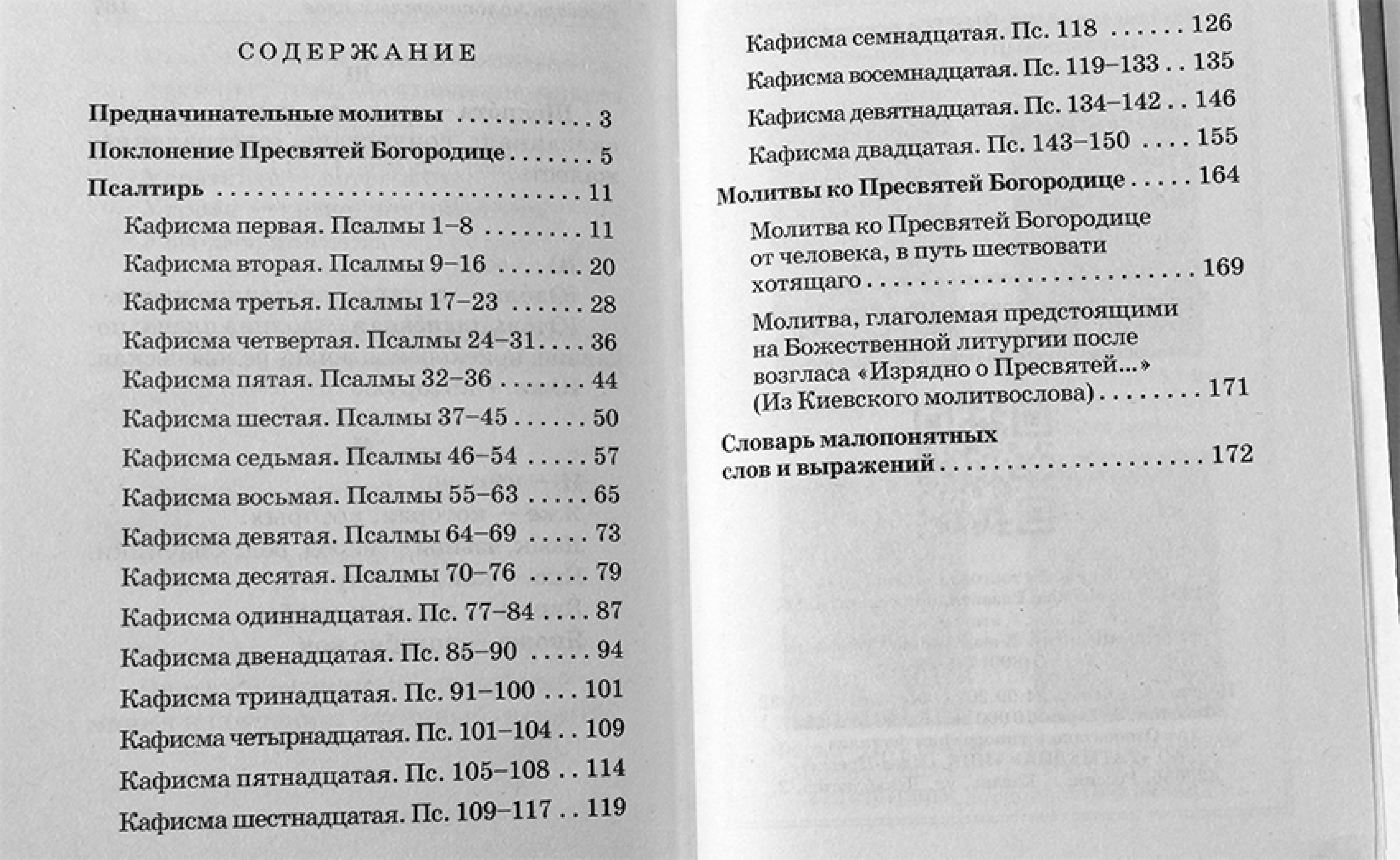 Издание в твердом переплете, содержит предначинательные молитвы, Псалтирь и молитвы Божией Матери, а также словарь малопонятных слов и выражений.