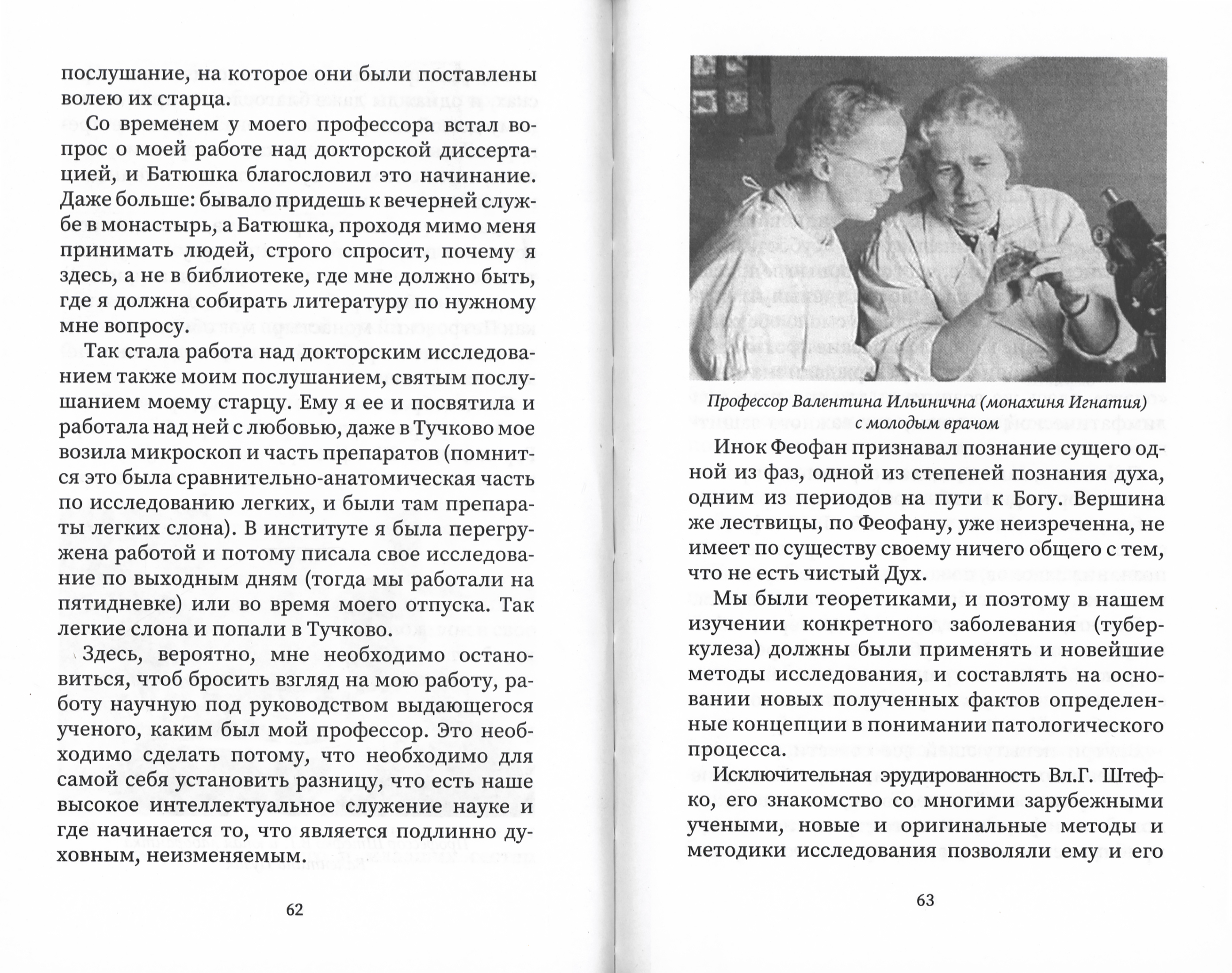Эта книга — размышления удивительного человека: выдающегося ученого с мировым именем, доктора биологических наук, профессора, фтизиопатолога и тайной схимонахини Игнатии — о поиске своего пути, о жизни души, о встрече с Богом, о вере и науке. Возможно ли было совместить такое в годы гонений на Церковь в XX веке? Схимонахиня Игнатия (Валентина Ильинична Пузик) — несомненный пример того, как настоящая наука и вера идут рука об руку и не могут противоречить друг другу. Изучая возможности лечения туберкулеза, она воспринимала работу как служение Богу и ближнему, а научную деятельность — как монастырское послушание. Именно усердное рвение о Господе привело Валентину Ильиничну к написанию докторской диссертации и званию профессора. Она была удостоена таких наград, как Орден Трудового Красного Знамени, девяти медалей, получила звание «Заслуженного работника медицины».