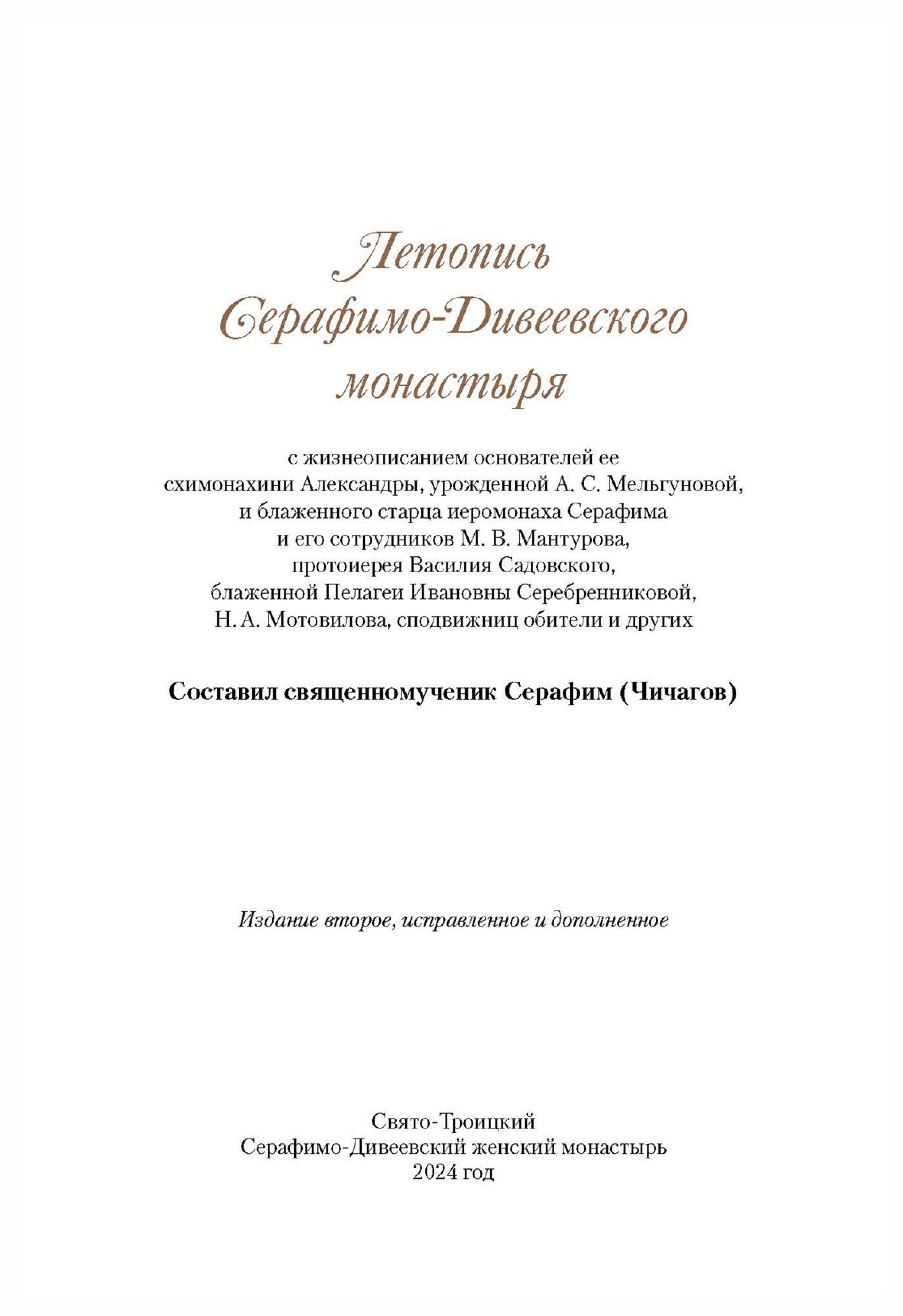 «Летопись Серафимо-Дивеевского монастыря», составленная священномучеником Серафимом Чичаговым, до нашего времени остается благодатным источником наиболее полных духовно-исторических сведений об этой святой обители. Настоящая книга представляет собой текст, подготовленный автором к печати в 1896 году, с учетом вычеркнутого цензурой.