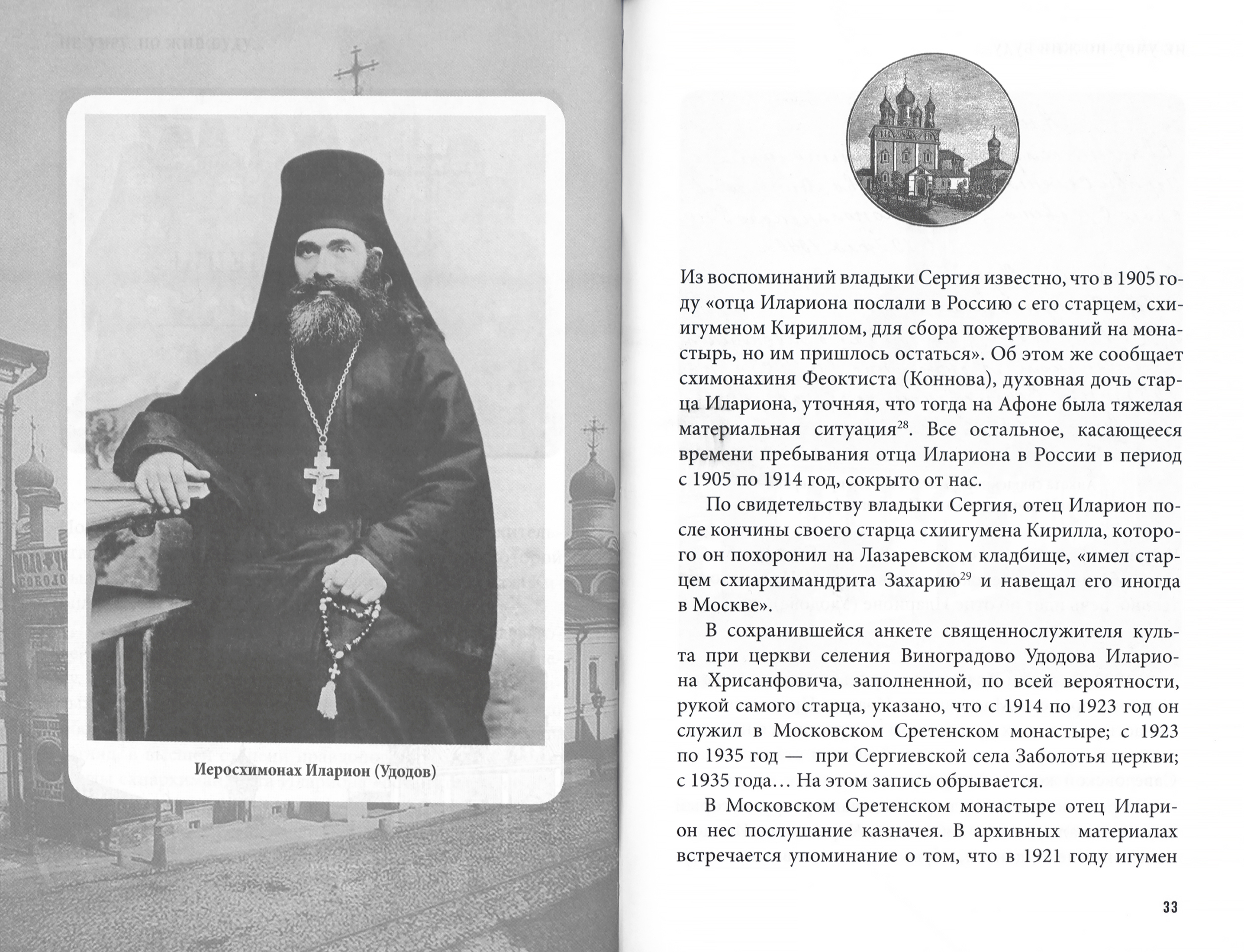 Схиархимандрит Иларион в течение двадцати лет подвизался на Святой Горе Афонской, где принял монашеский постриг. После возвращения в Россию нес различные послушания. С 1935 года до самой кончины старец Иларион был настоятелем в храме Владимирской иконы Божией Матери в селе Виноградово Московской области. На территории храма старец нашел место своего упокоения.