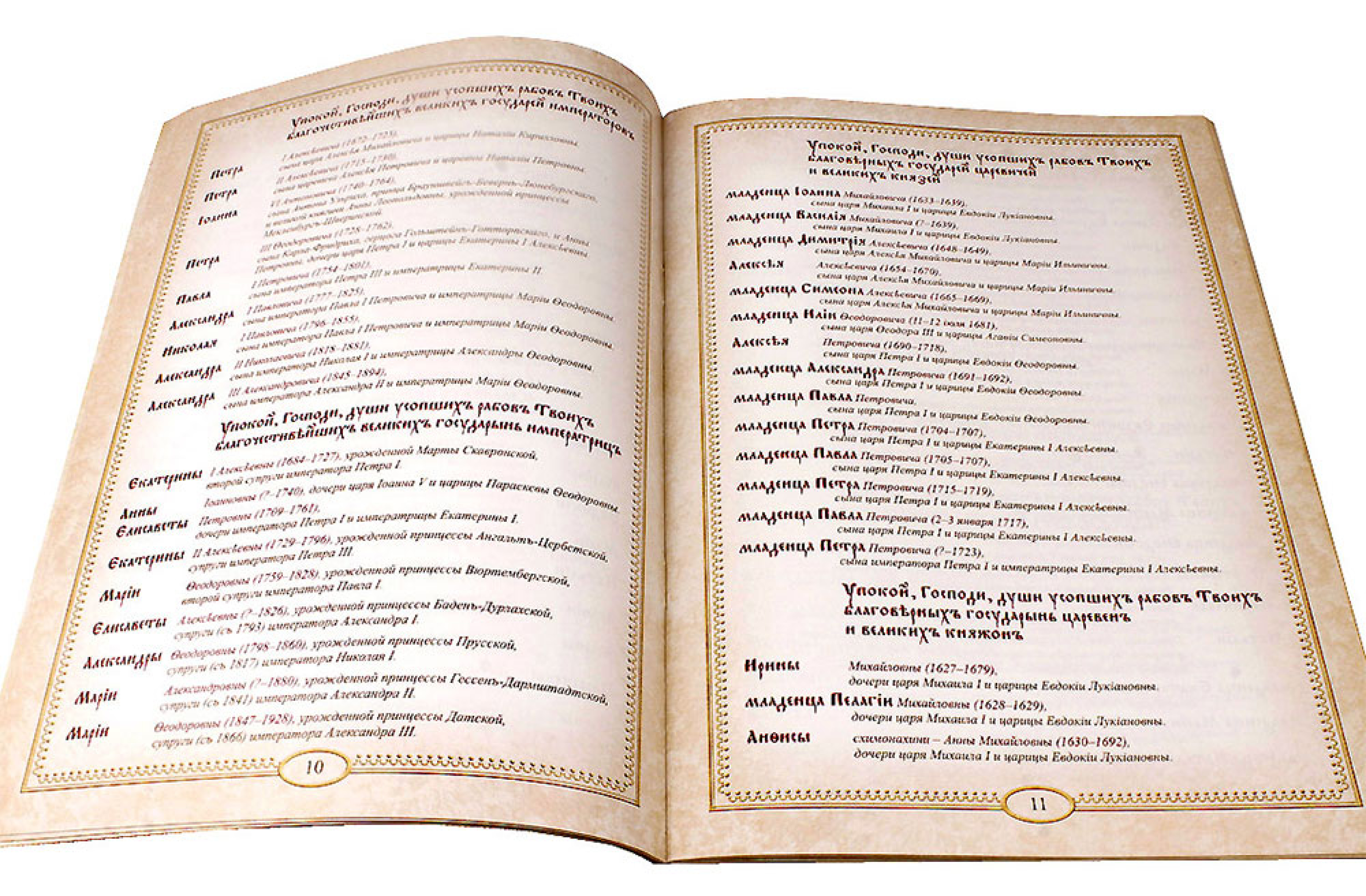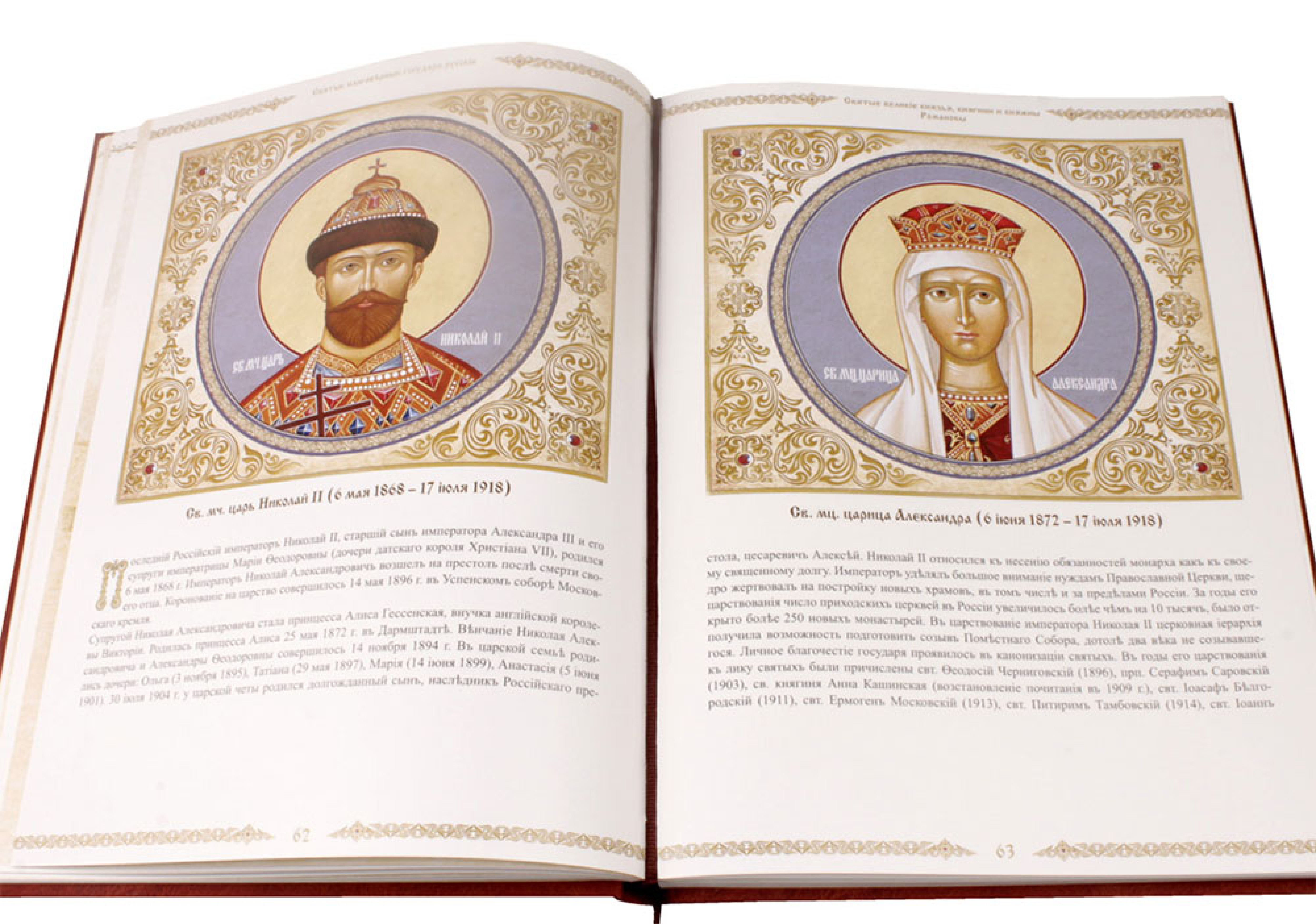 В книге яркие иллюстрации с иконами, ликами и портретами государей, сопровождаются жизнеописанием их и заслугами. К книге прилагается брошюрованный синодик-помянник государей русских.