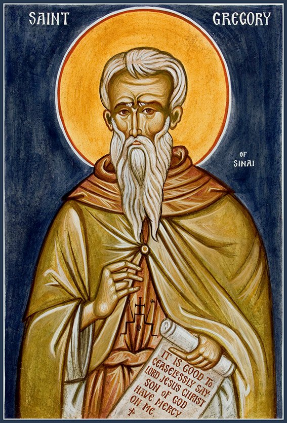 Преподобный Григорий Синаит родился около 1268 года в приморском поселении Клазомены около г. Смирны (Малая Азия) от богатых родителей. Около 1290 года он был взят в плен агарянами и отправлен в Лаодикию. После освобождения преподобный прибыл на о. Кипр, где постригся в иноческий чин. Затем он отправился на Синайскую гору и принял там великую схиму. Исполняя послушания повара и пекаря, преподобный был также искусным писцом и превосходил всех в чтении и знании священных и отеческих книг. Строгость его жизни (пост, бдение, псалмопение, стояние на молитве) одних приводила в изумление, а у других вызывала зависть. Удалившись из монастыря, преподобный посетил Иерусалим. Некоторое время он жил на о. Крите, а затем обошел на Афоне все монастыри и всех подвижников. Таким путем он вобрал многовековой опыт иноческой жизни древнейших обителей. Лишь после этого преподобный Григорий Синаит построил себе в уединенном месте исихостерий – келлию для безмолвия и беспрепятственных занятий умной молитвой, соединенной с тяжелым иноческим трудом.